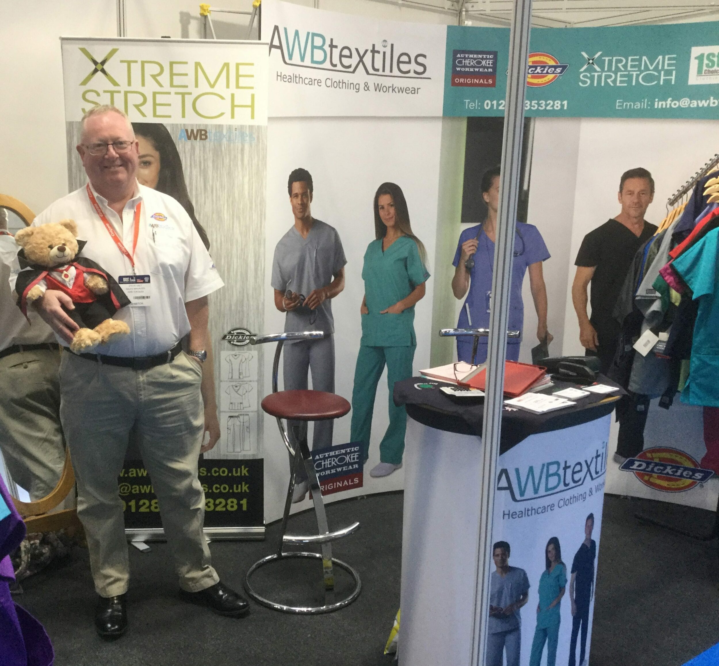 Pictured above is AWB Textile’s Steve Salt, preparing the stand and getting Cedric the Bear into shape for the selfie competition (winner to be announced shortly).