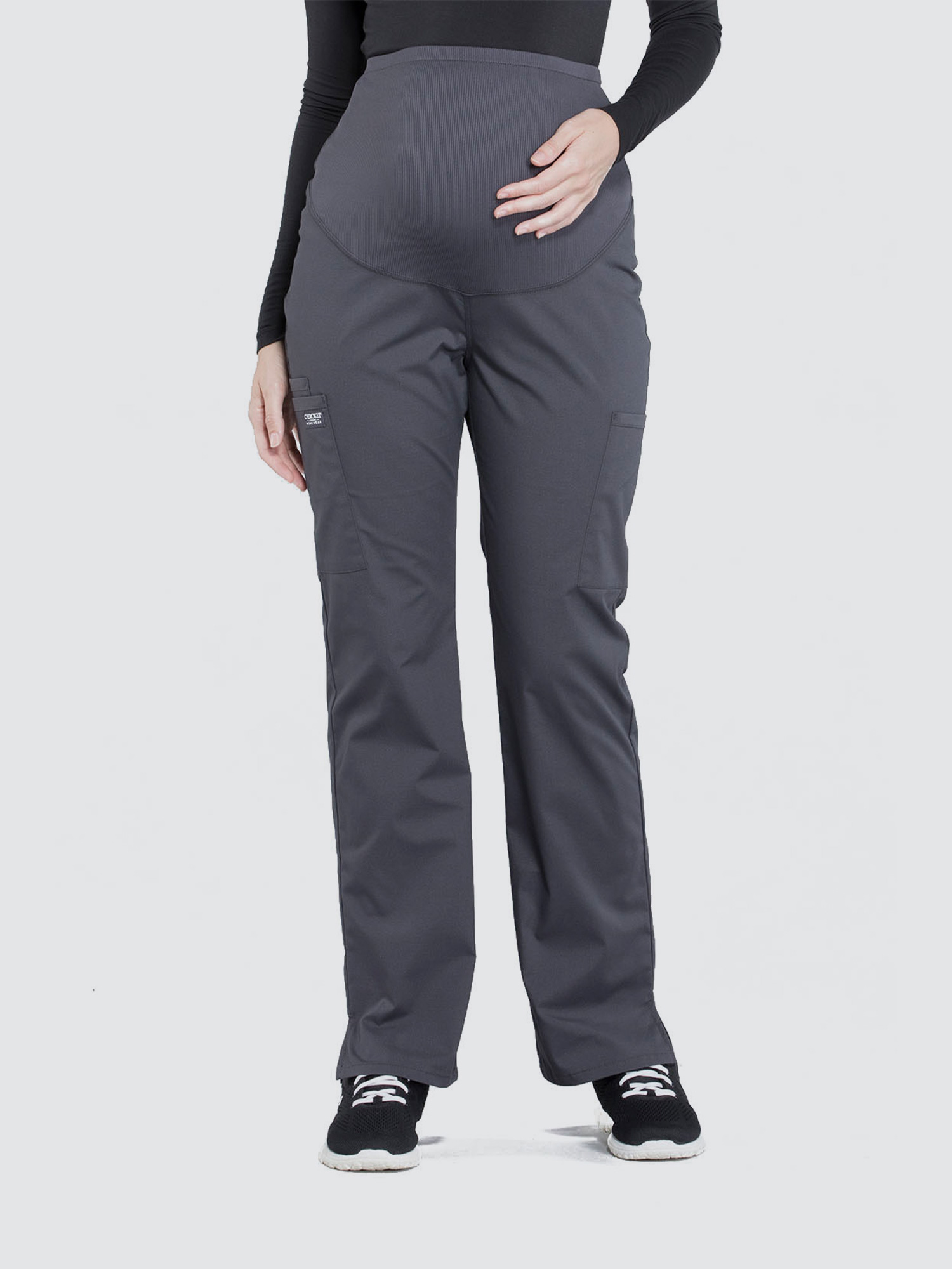 From Cherokee we have a straight leg trouser featuring a soft rib knit panel that stretches over your belly for maximum coverage and support.