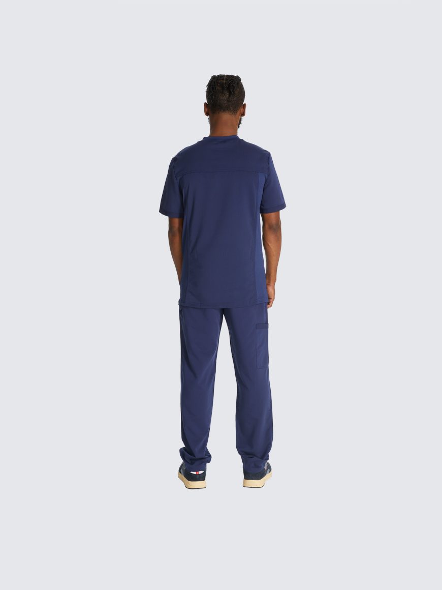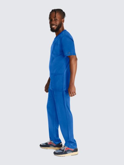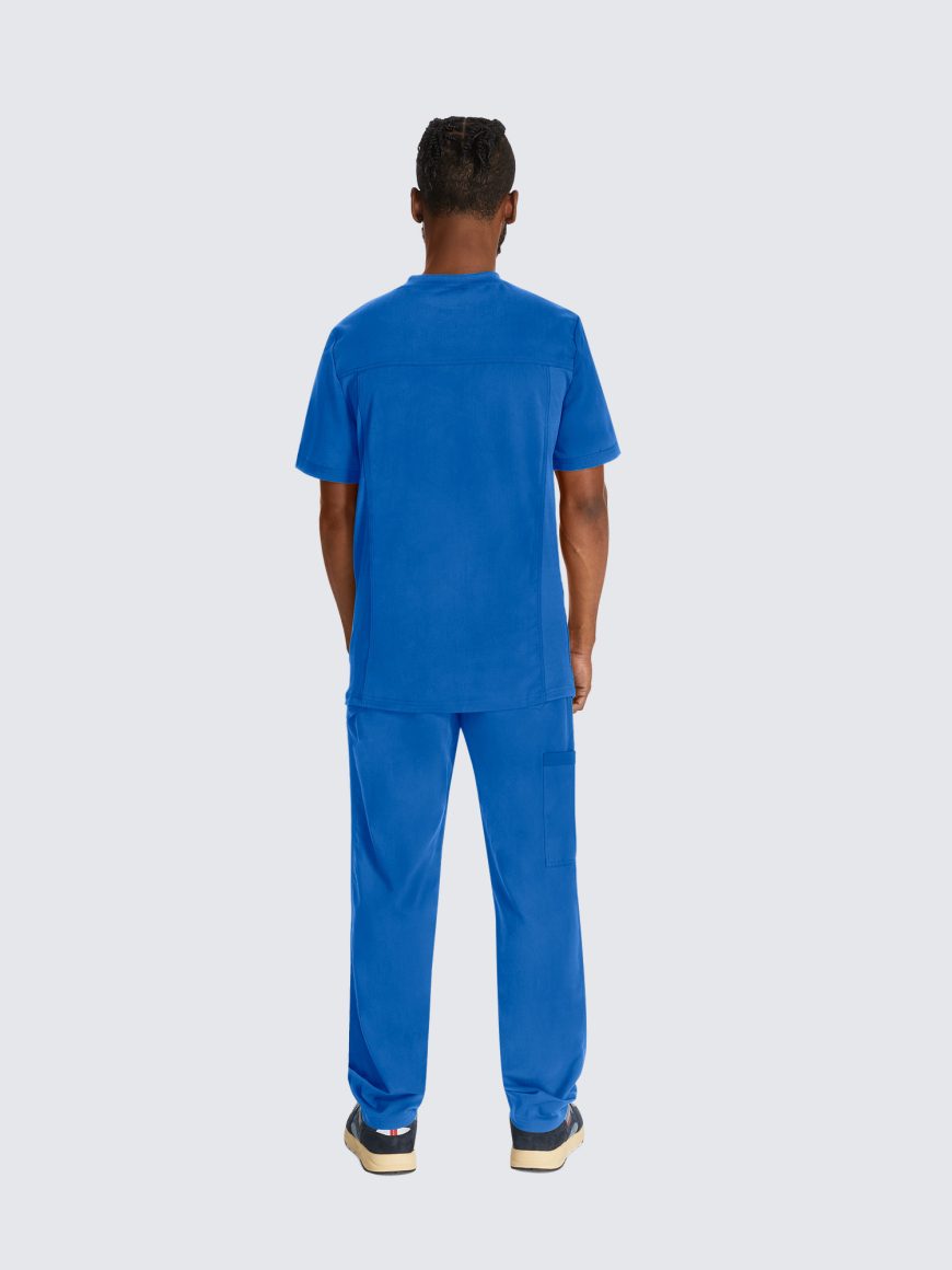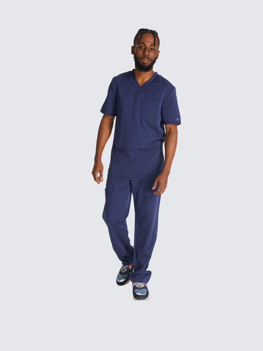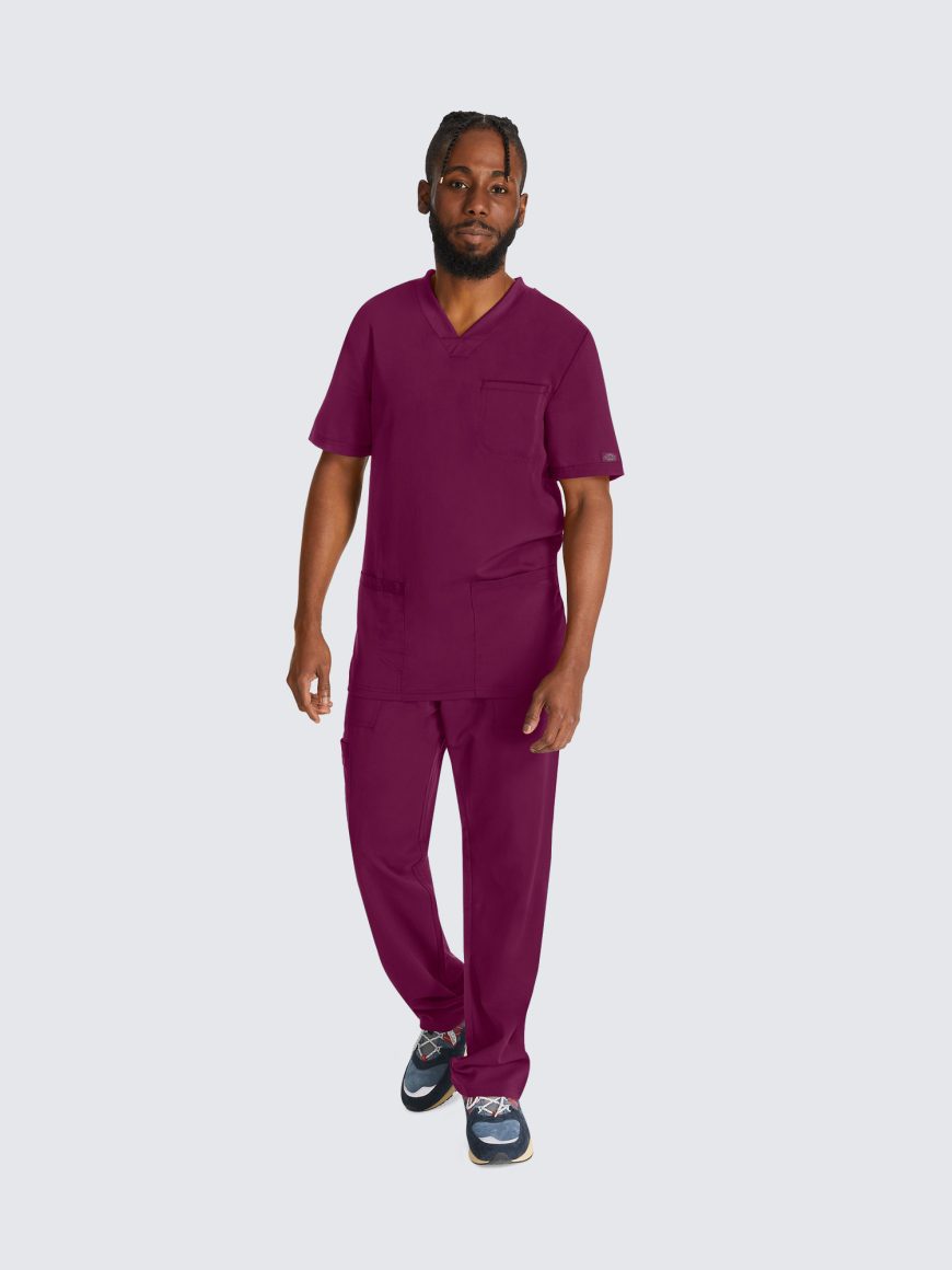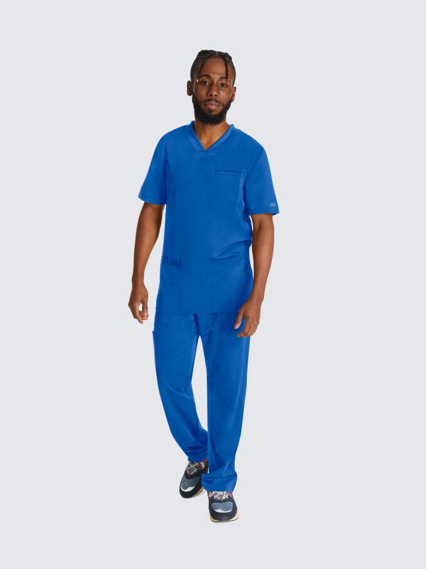 This Men’s V-neck top has a luxurious 2-way stretch fabric with three pockets; one chest pocket, two roomy patch pockets with a pencil stitch at wearer’s right, back yoke seam and comfort side knit panels. Knit neck band provides additional function and ease; alonside a mid rise, straight leg pant featuring a luxurious 2-way stretch fabric with fly front with a full elastic waistband and inside drawstring for a secure fit.