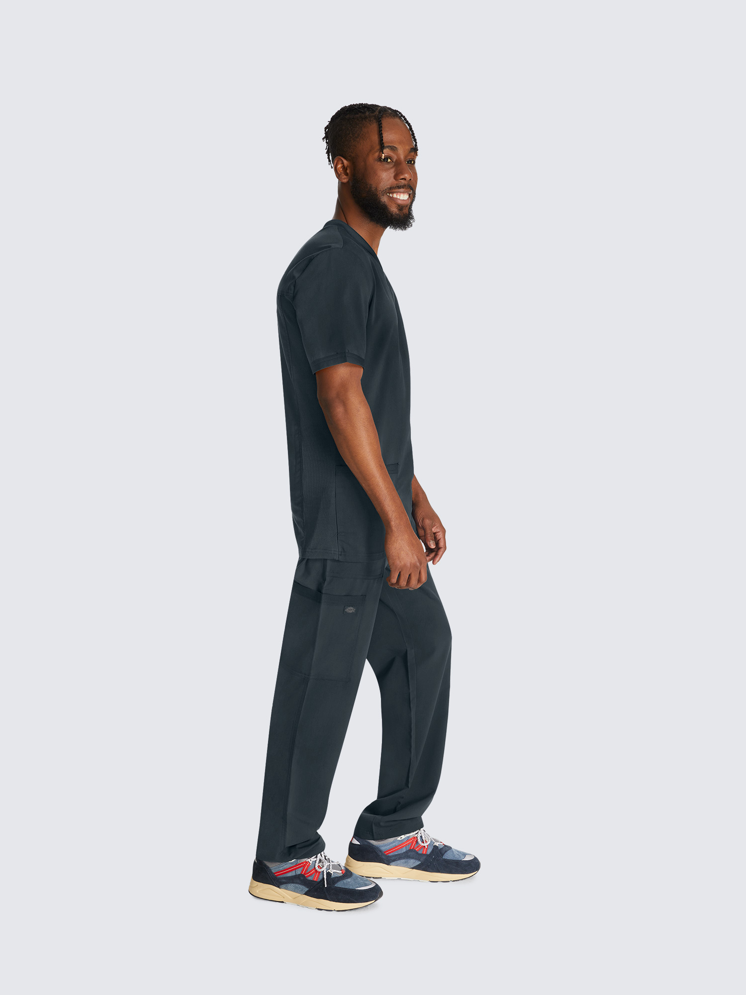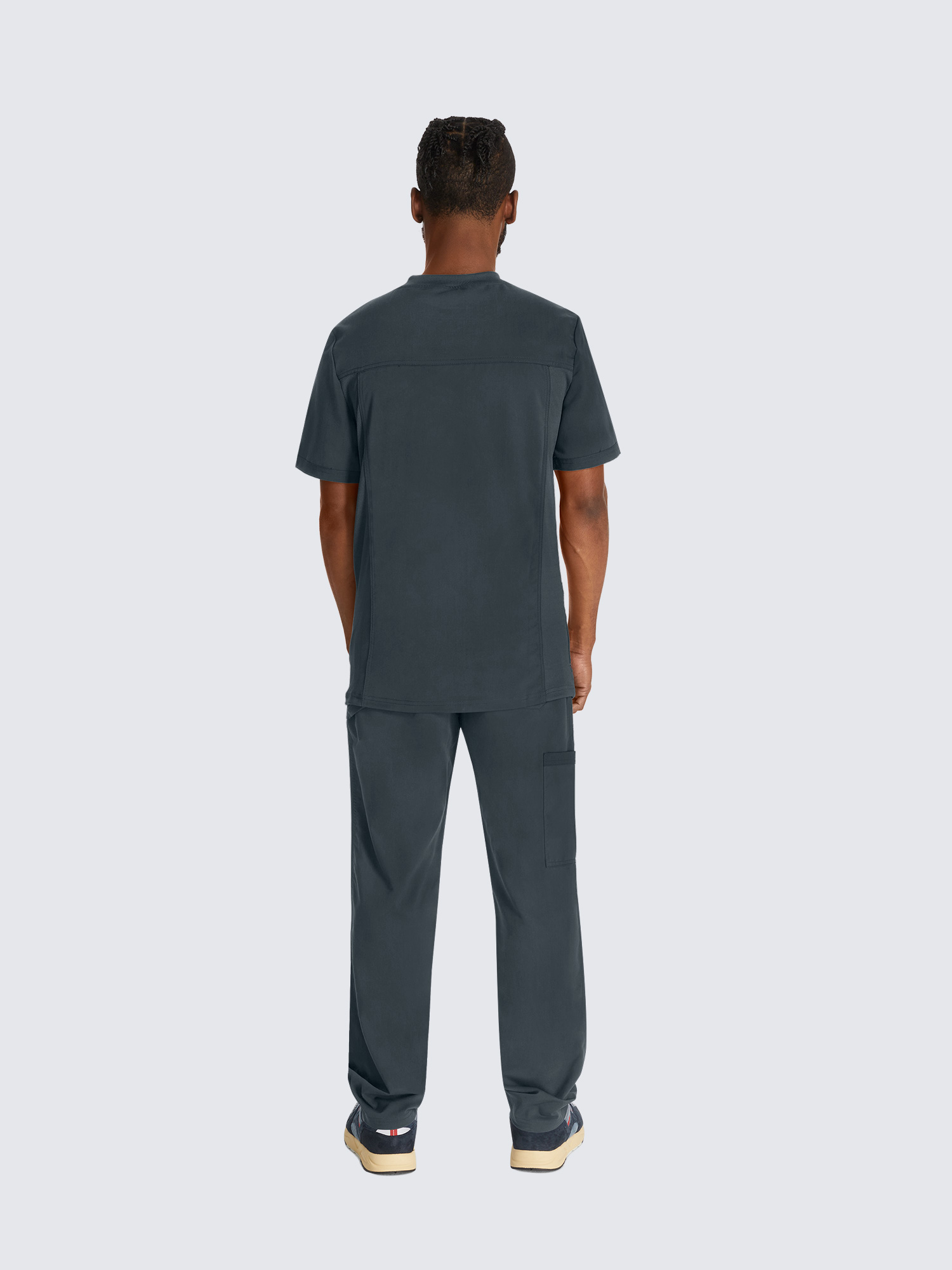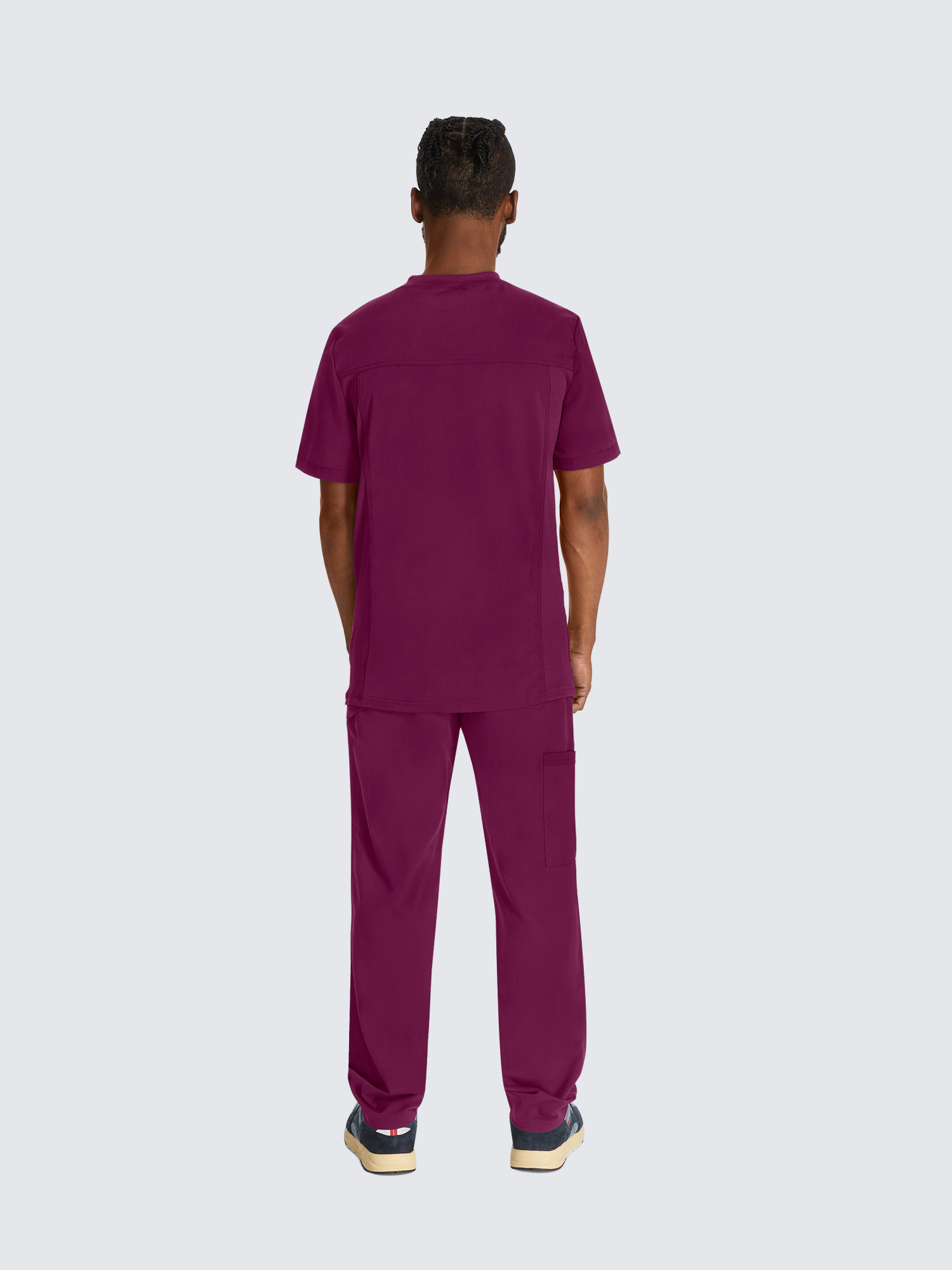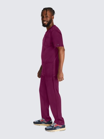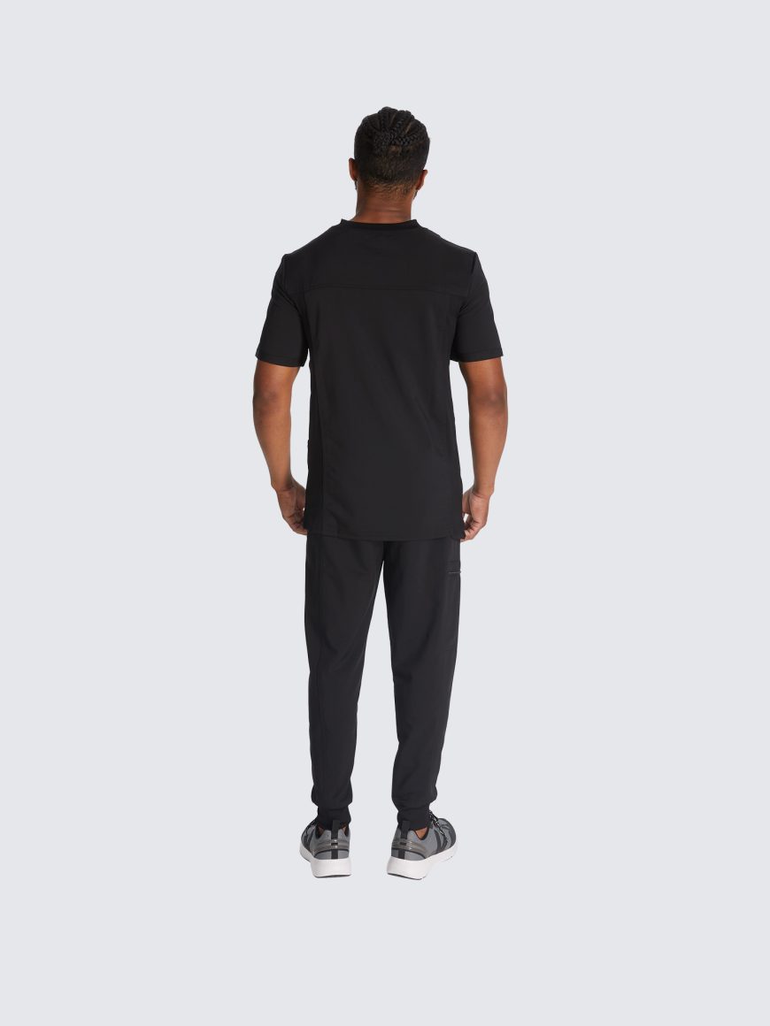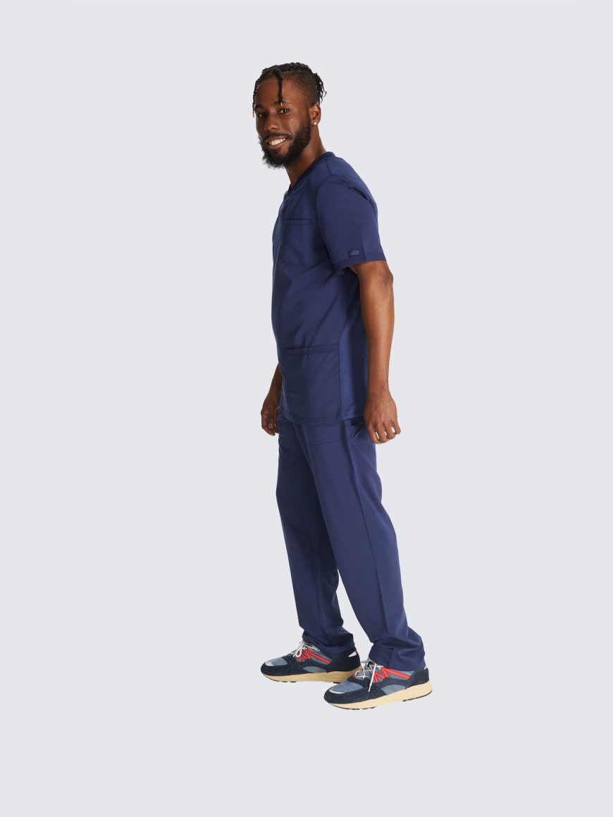 This Men’s V-neck top has a luxurious 2-way stretch fabric with three pockets; one chest pocket, two roomy patch pockets with a pencil stitch at wearer’s right, back yoke seam and comfort side knit panels. Knit neck band provides additional function and ease; alonside a mid rise, straight leg pant featuring a luxurious 2-way stretch fabric with fly front with a full elastic waistband and inside drawstring for a secure fit.