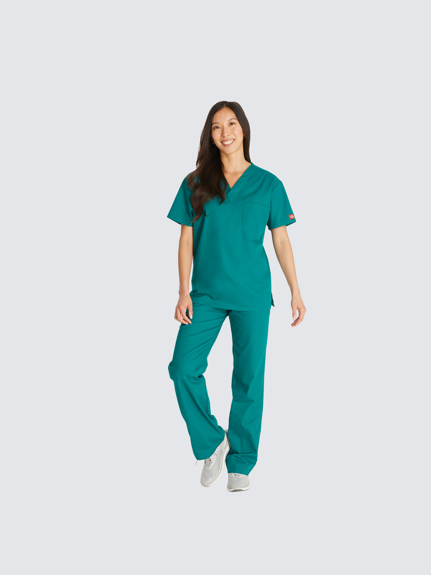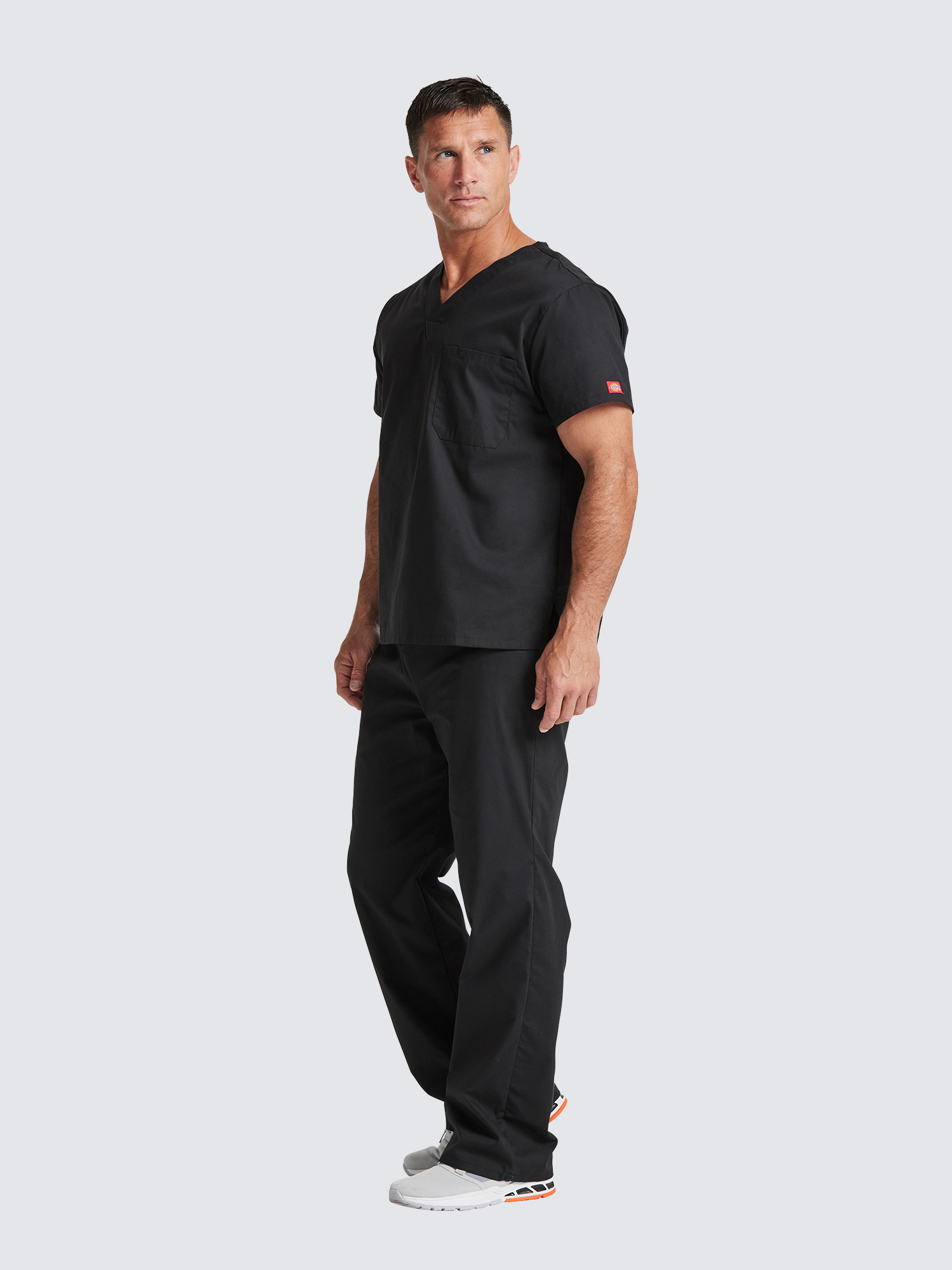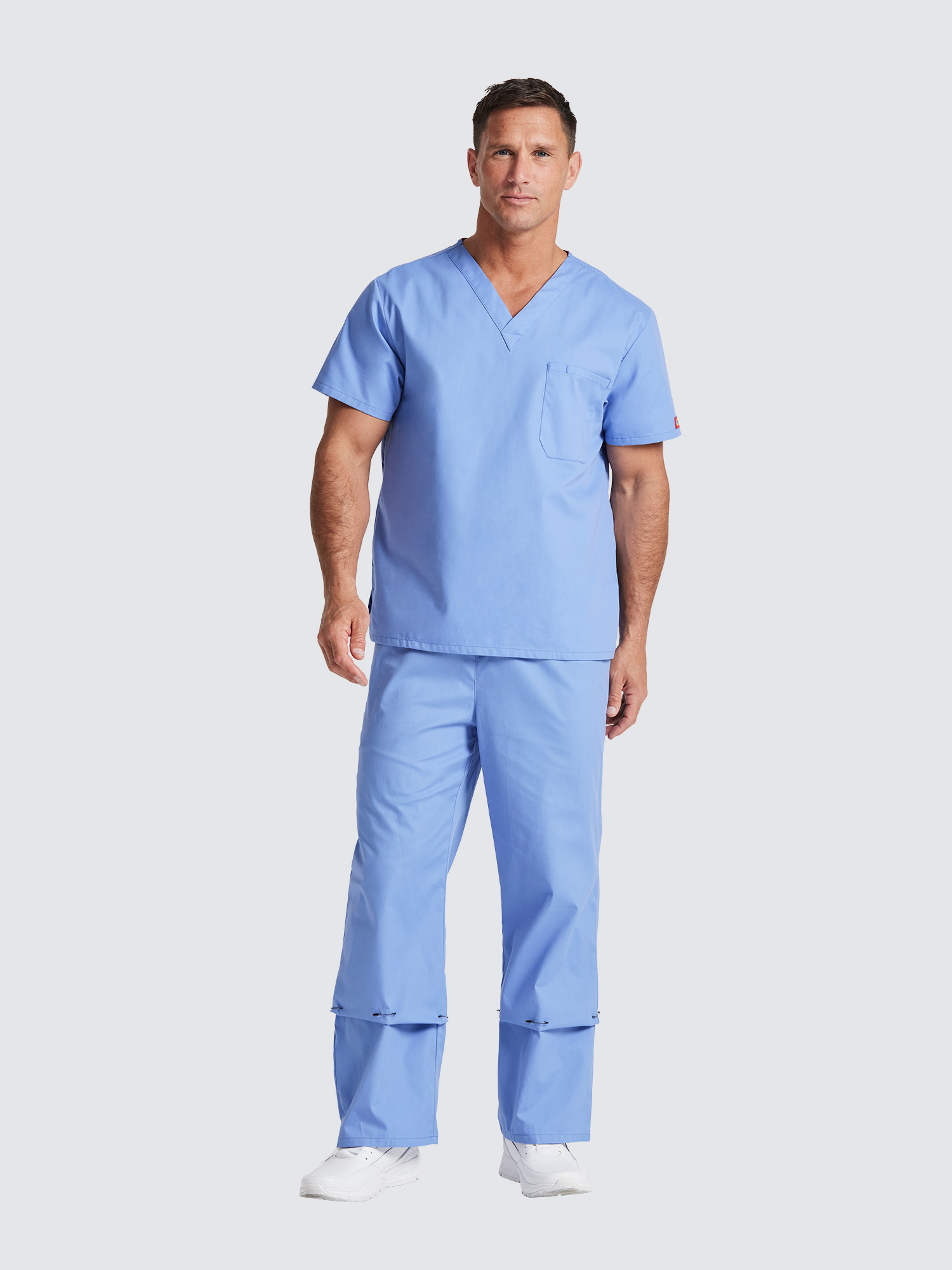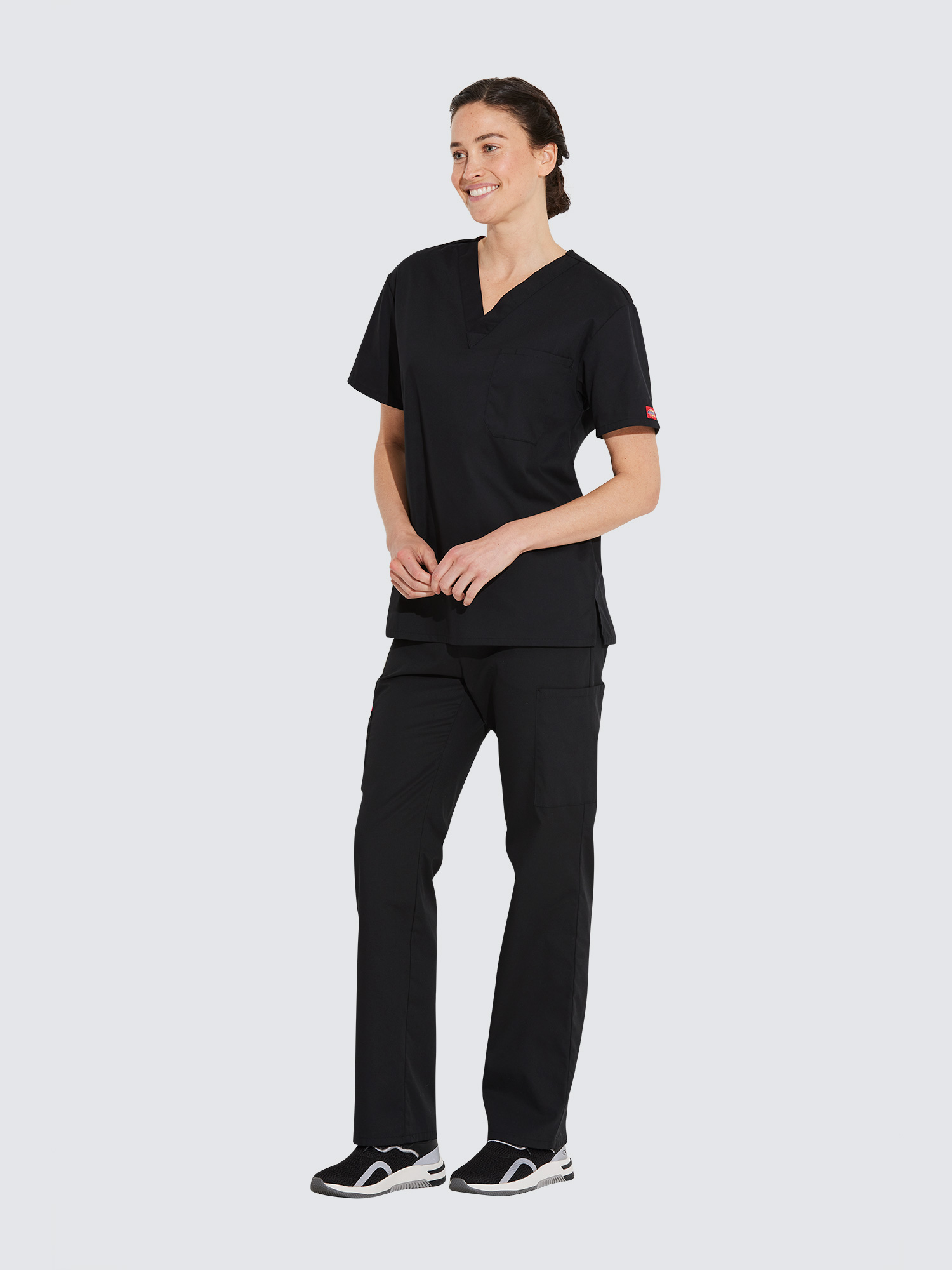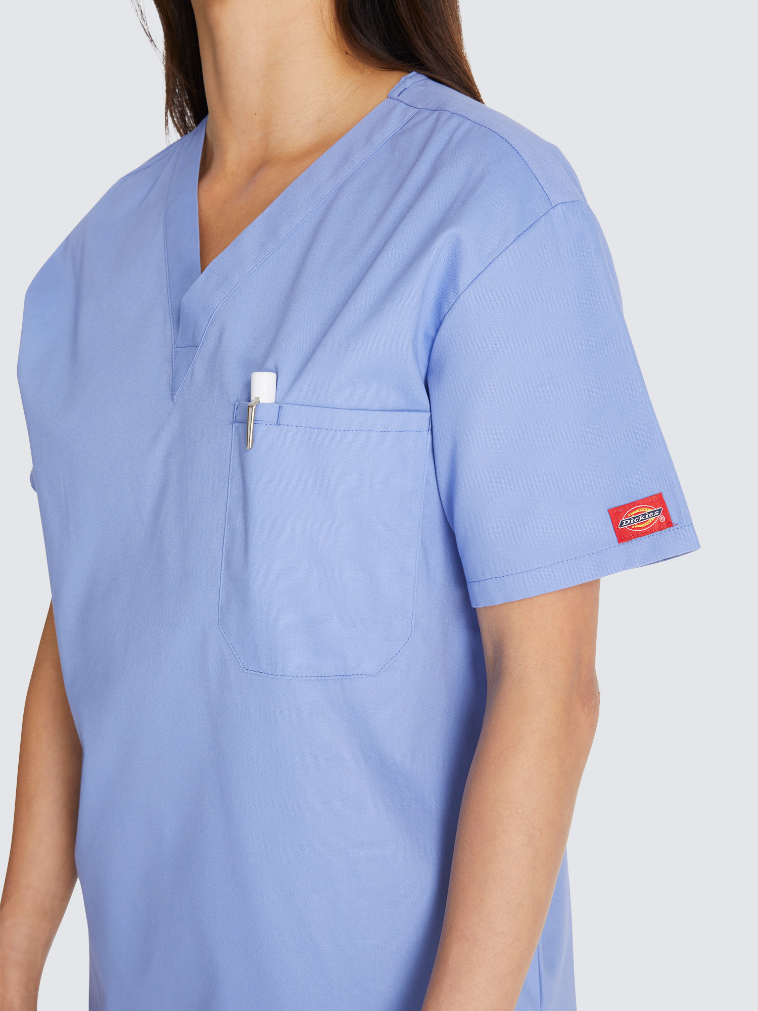 Unisex V-neck top features Dickies logo twill tape at the back neck, a front chest pocket with a bar-tacked pencil slot and side vents.