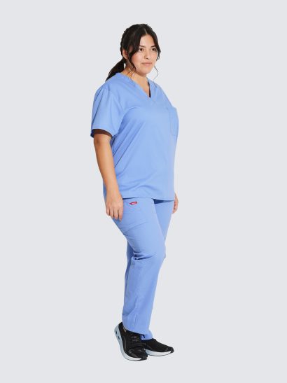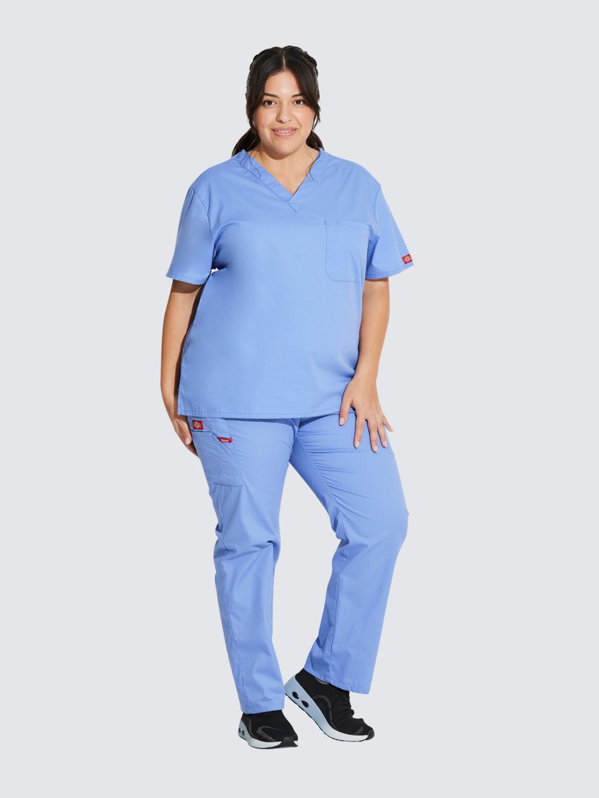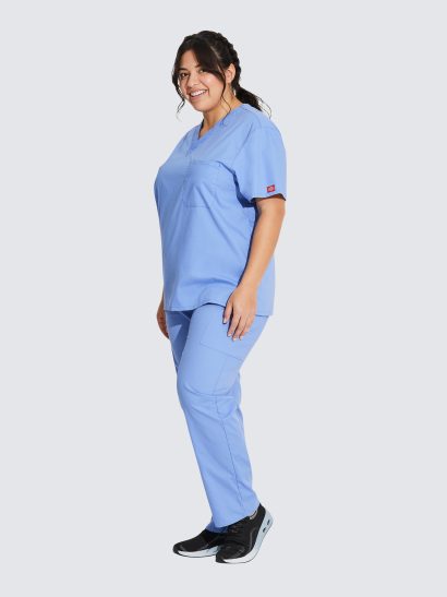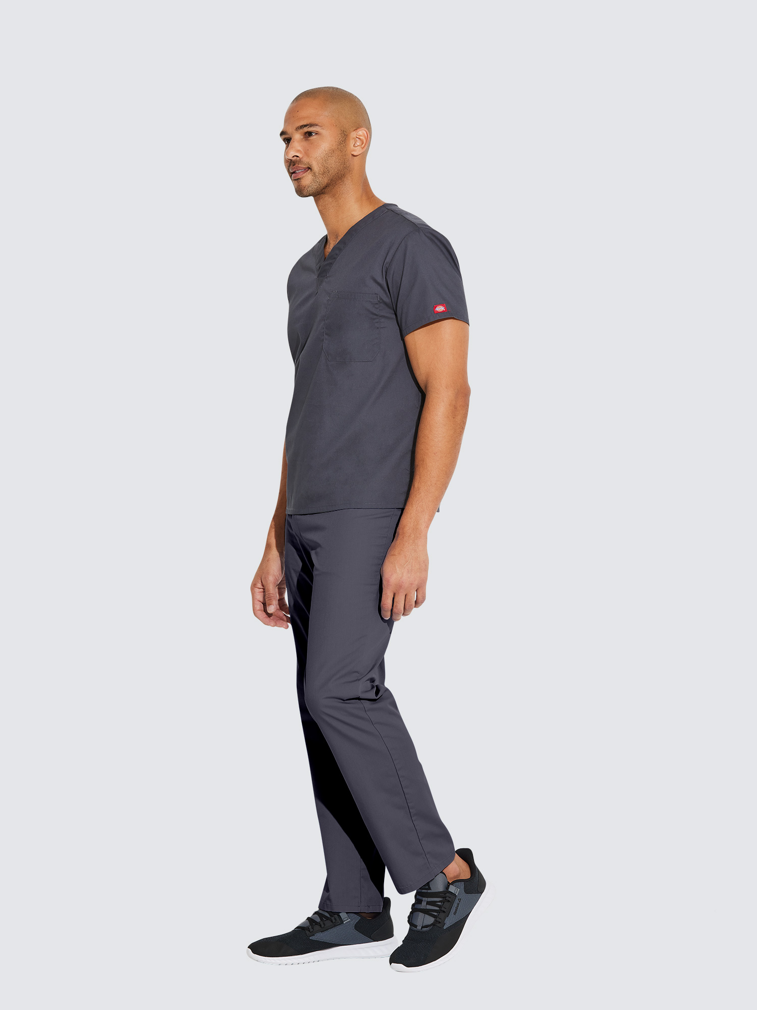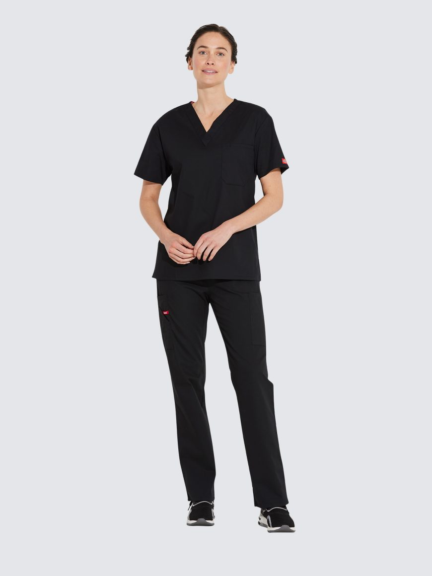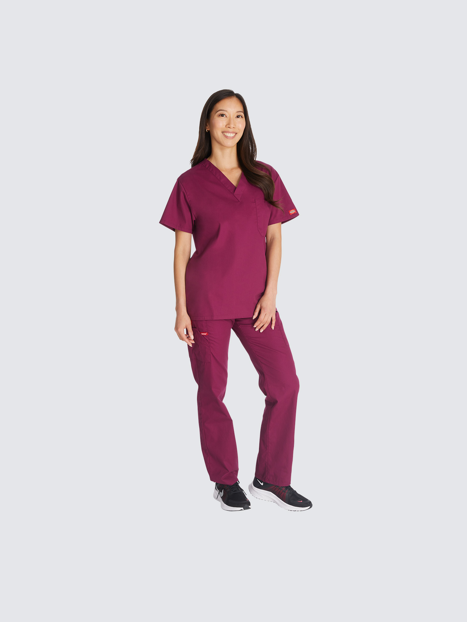 Unisex V-neck top features Dickies logo twill tape at the back neck, a front chest pocket with a bar-tacked pencil slot and side vents.