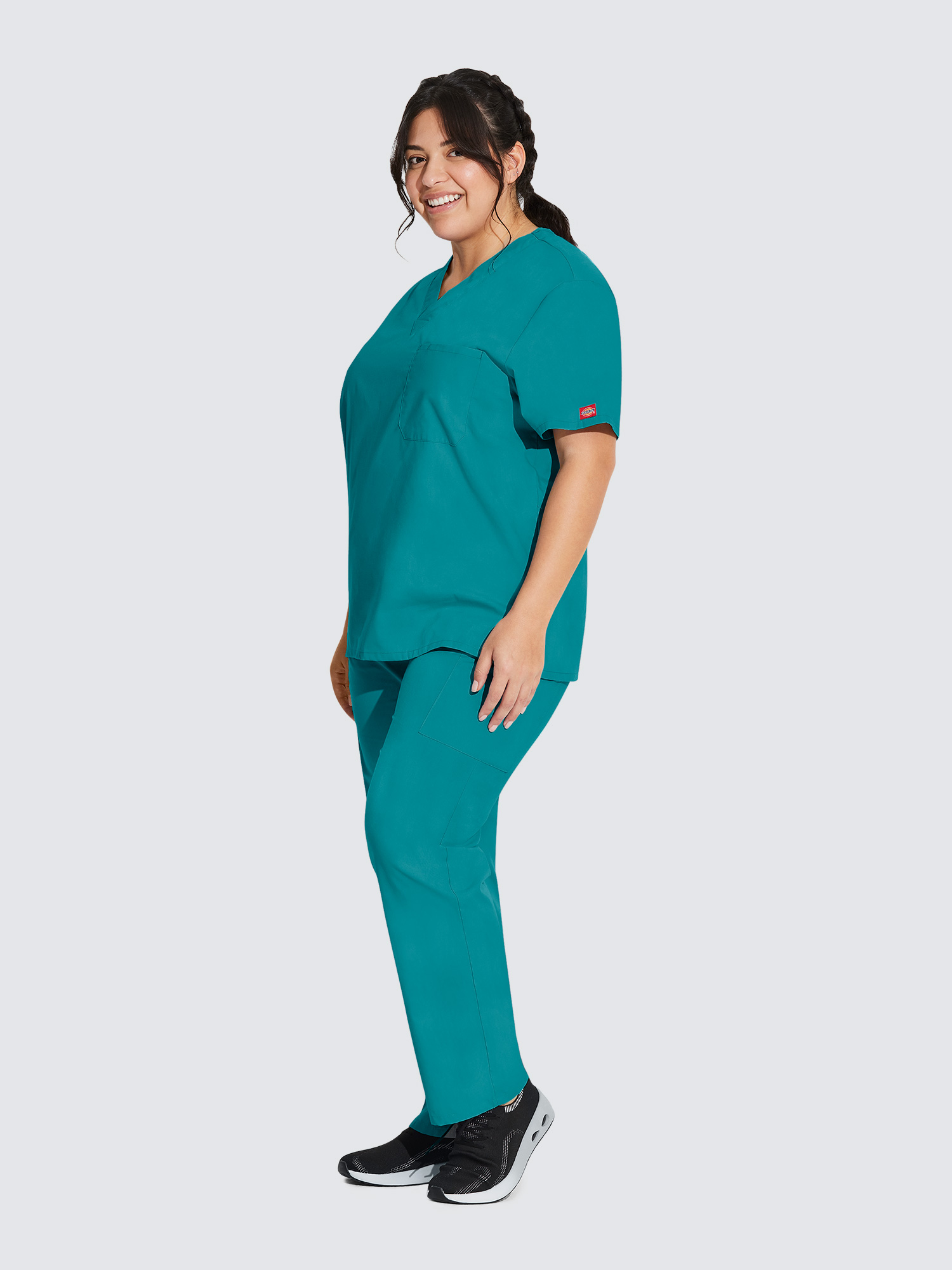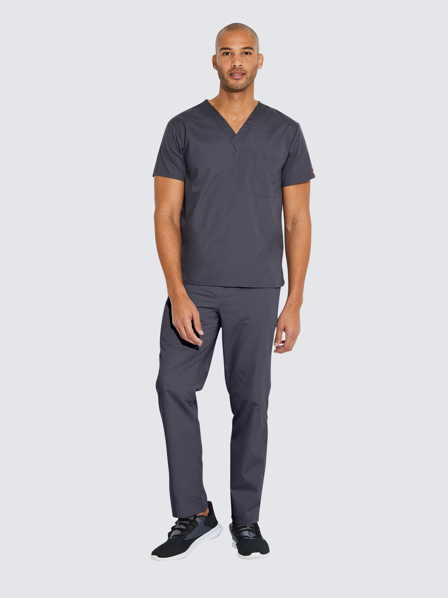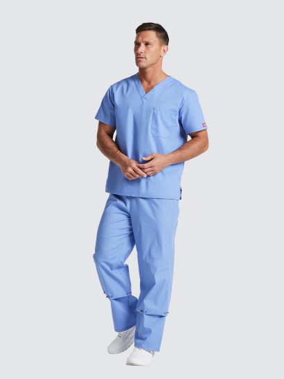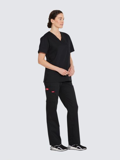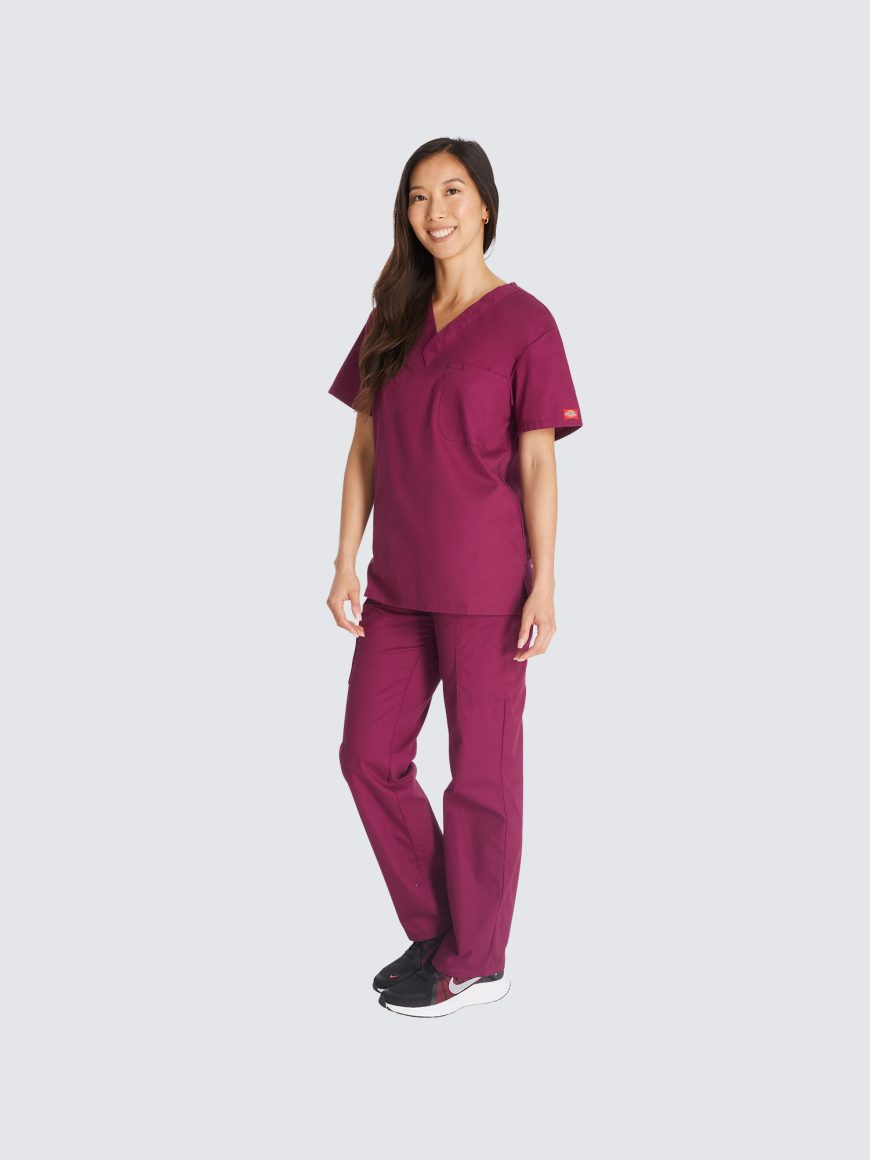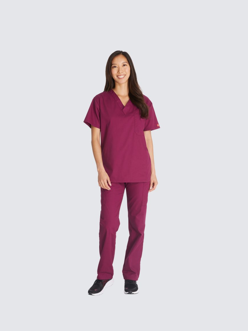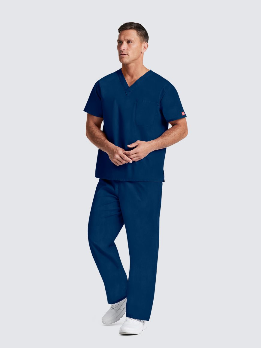 Unisex V-neck top features Dickies logo twill tape at the back neck, a front chest pocket with a bar-tacked pencil slot and side vents.