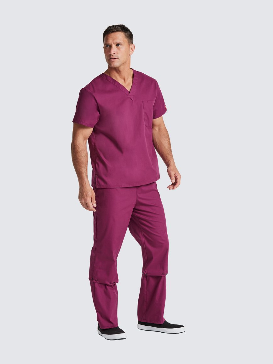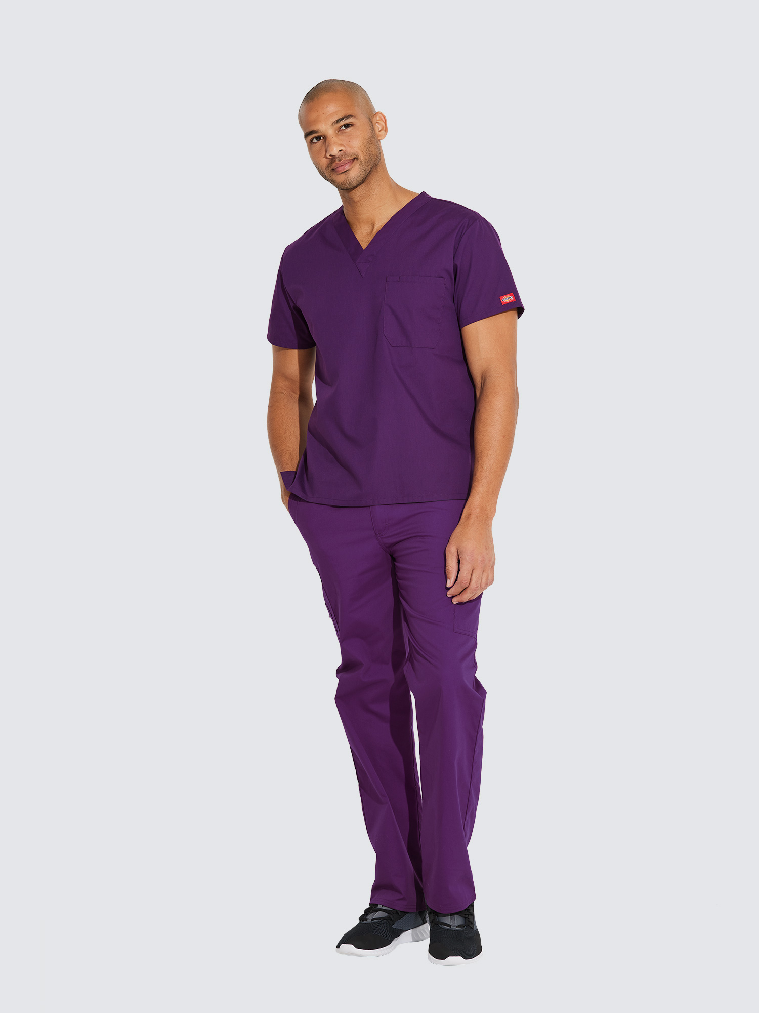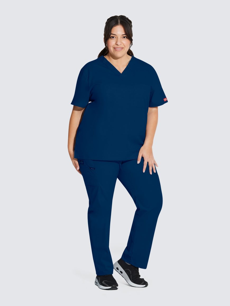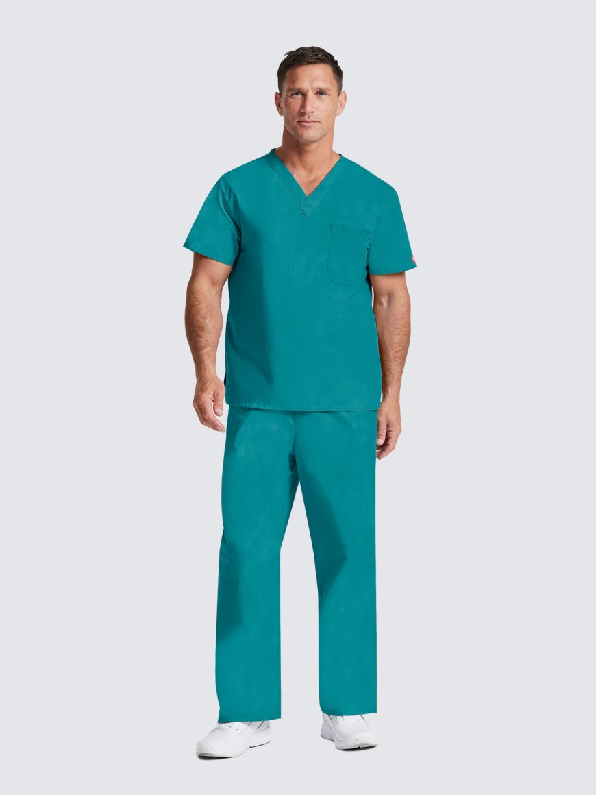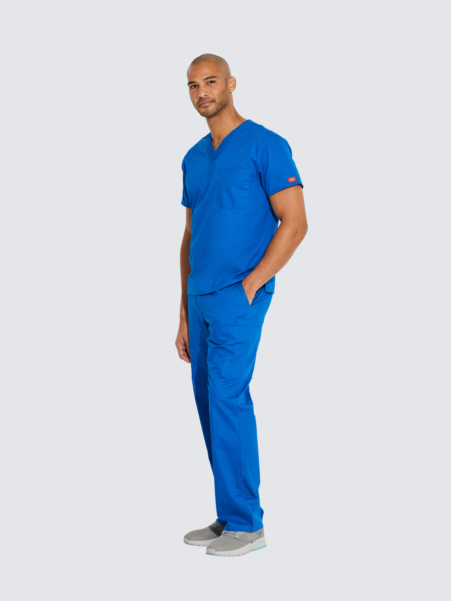 Unisex V-neck top features Dickies logo twill tape at the back neck, a front chest pocket with a bar-tacked pencil slot and side vents.