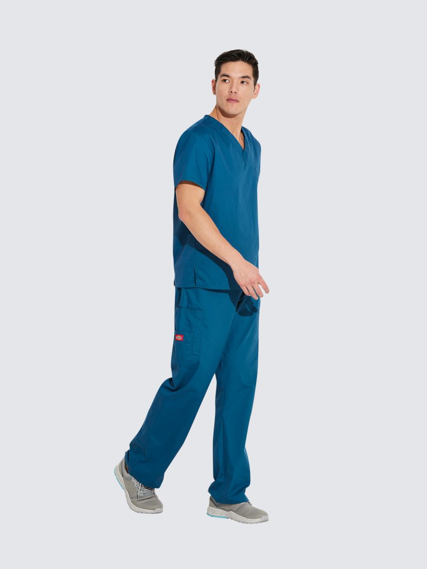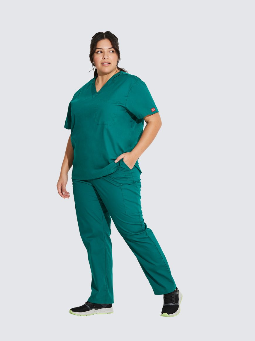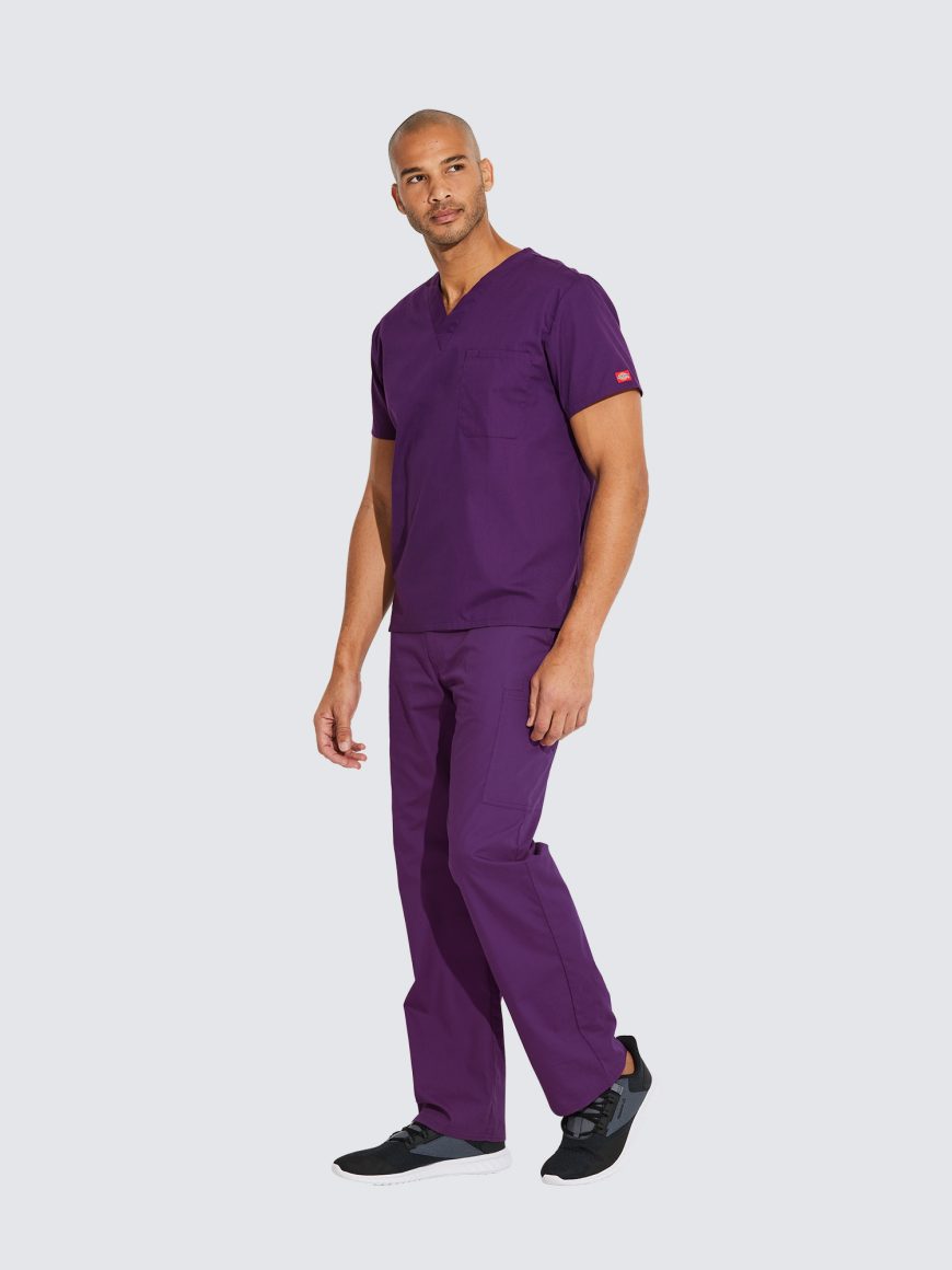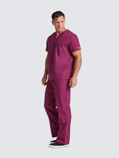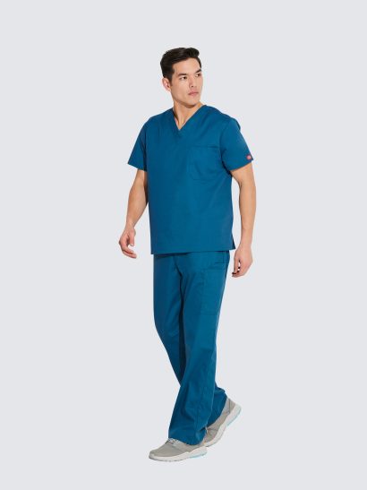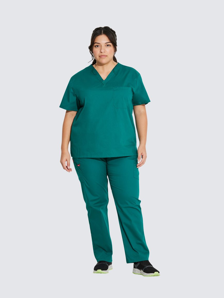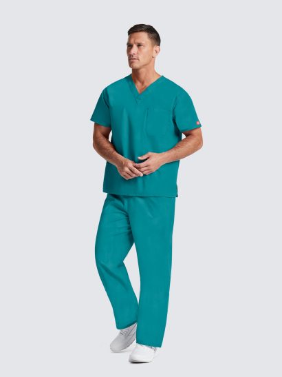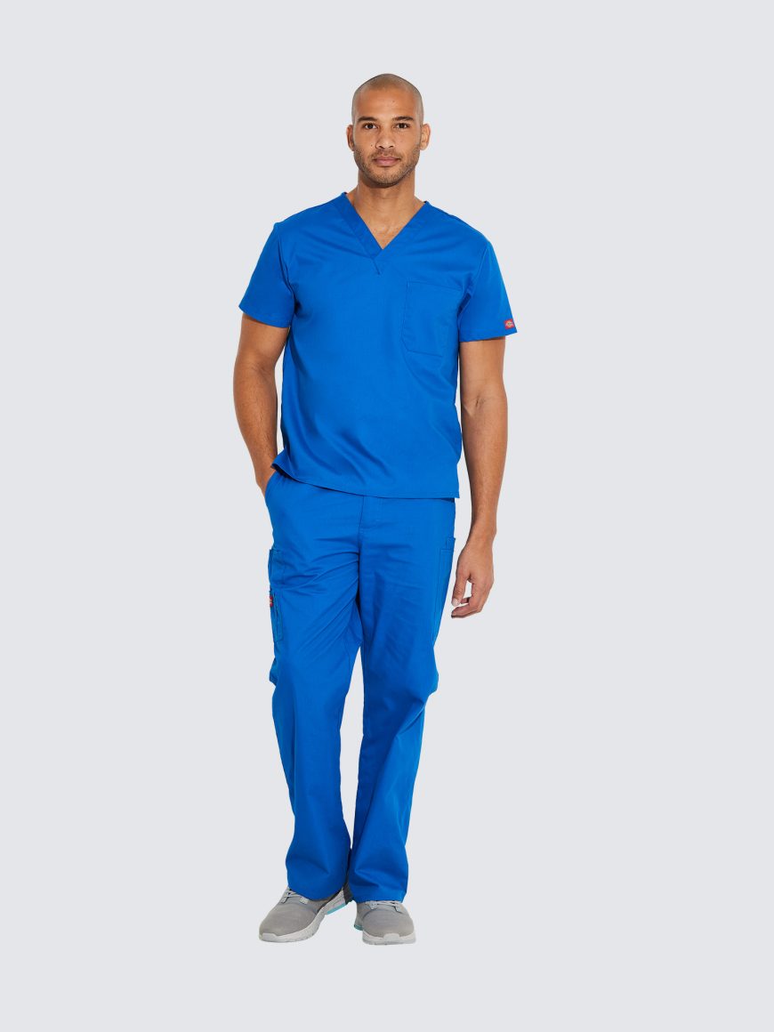 Unisex V-neck top features Dickies logo twill tape at the back neck, a front chest pocket with a bar-tacked pencil slot and side vents.