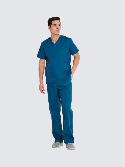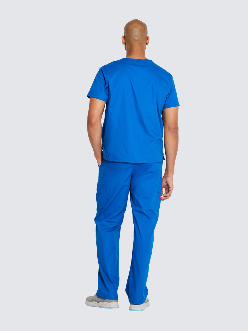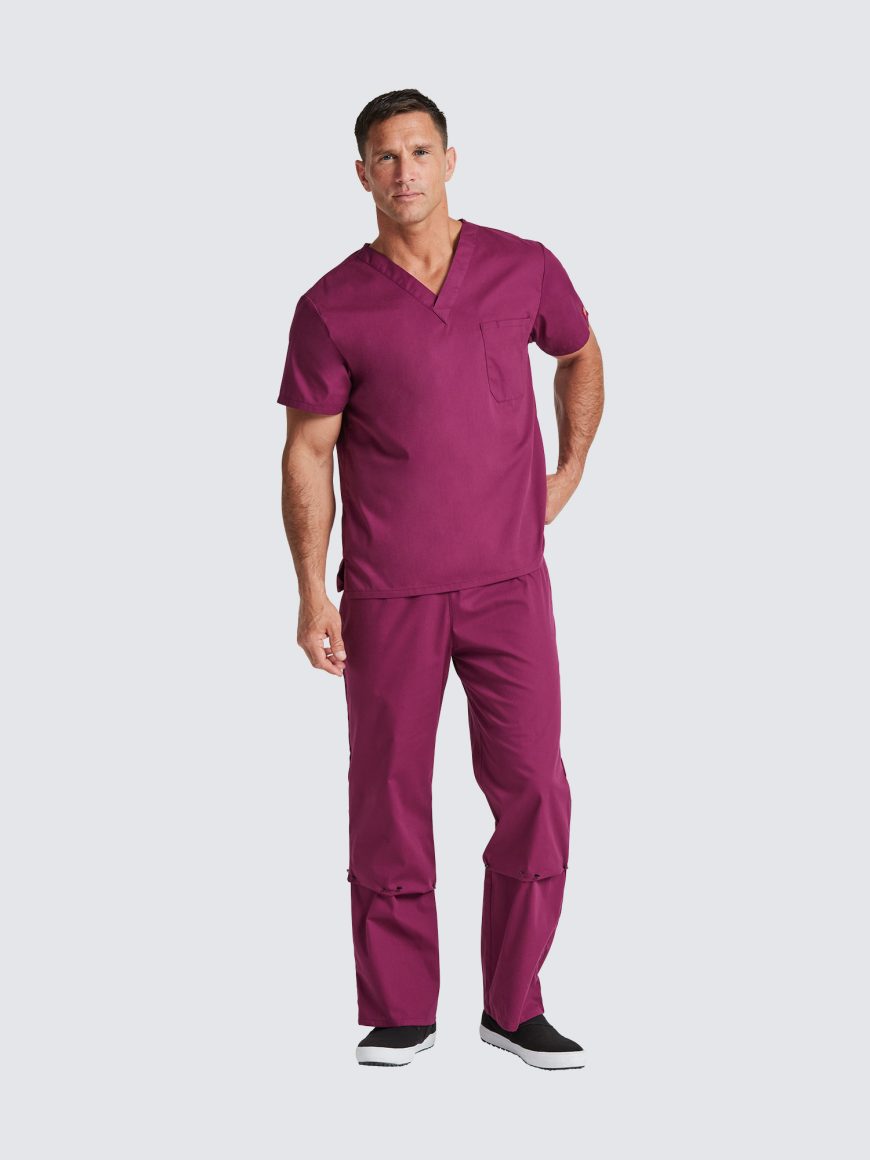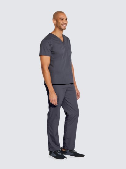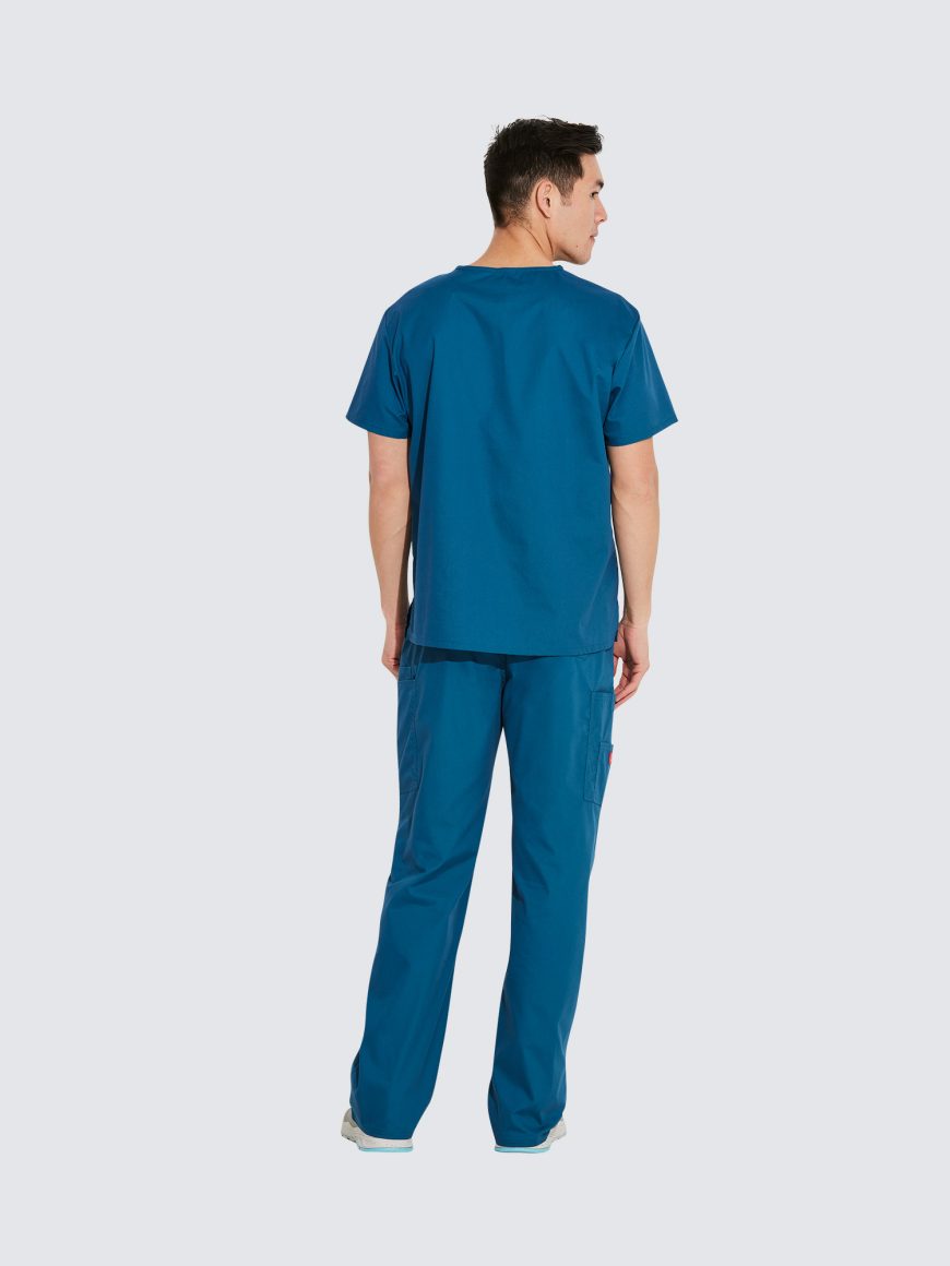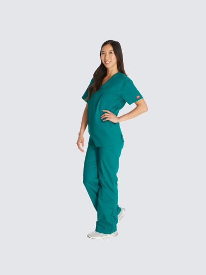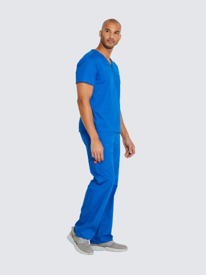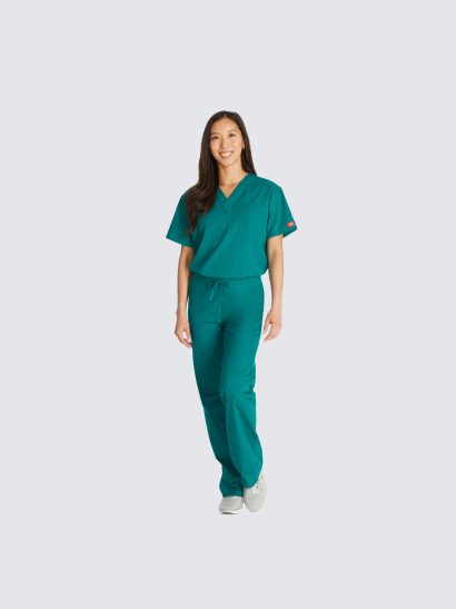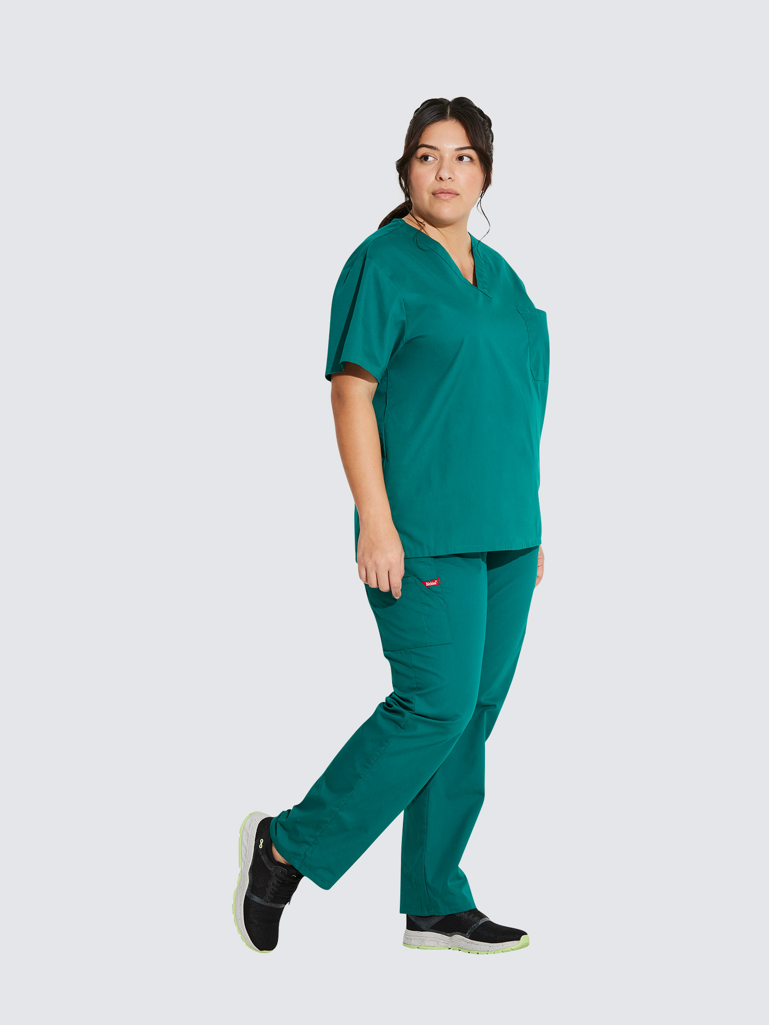 Unisex V-neck top features Dickies logo twill tape at the back neck, a front chest pocket with a bar-tacked pencil slot and side vents.