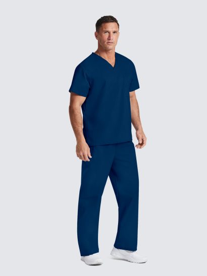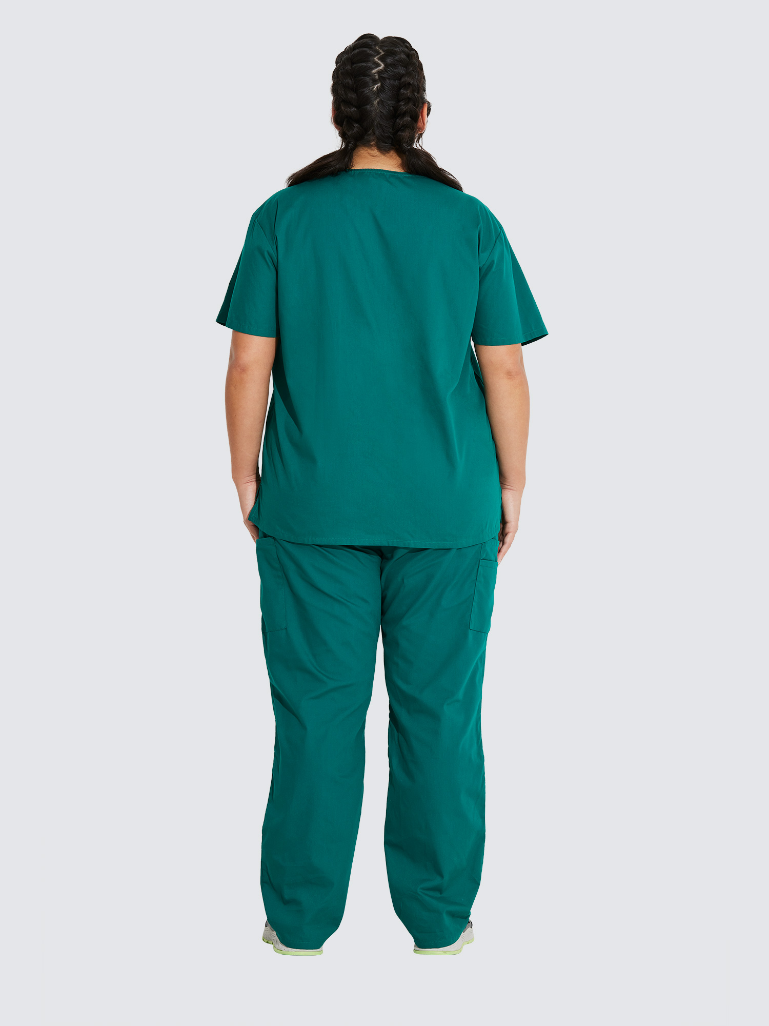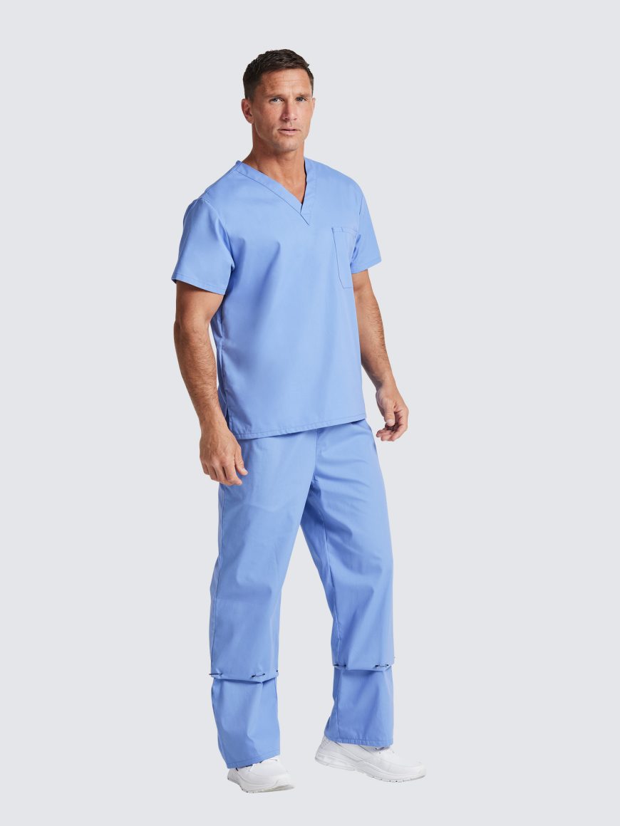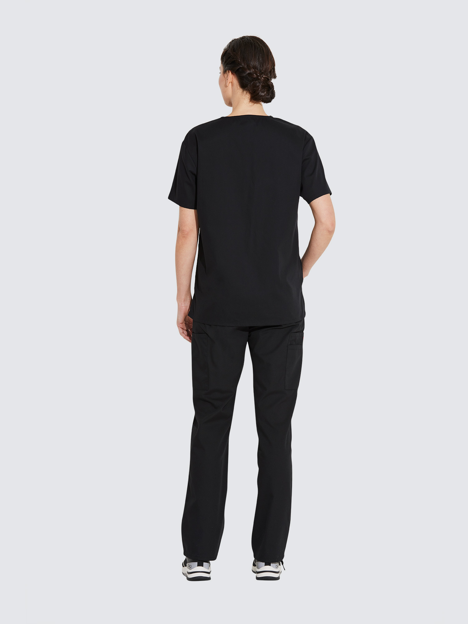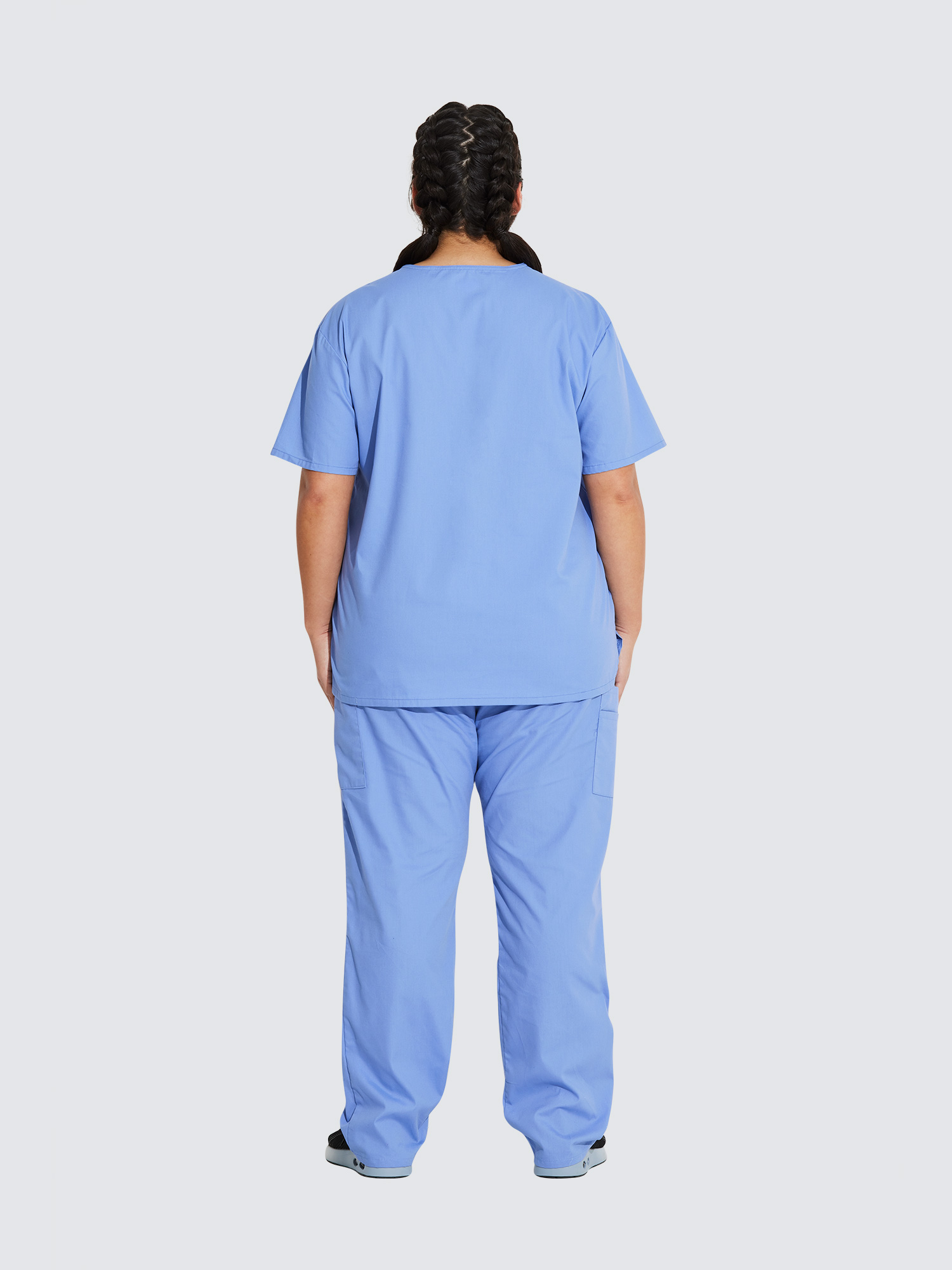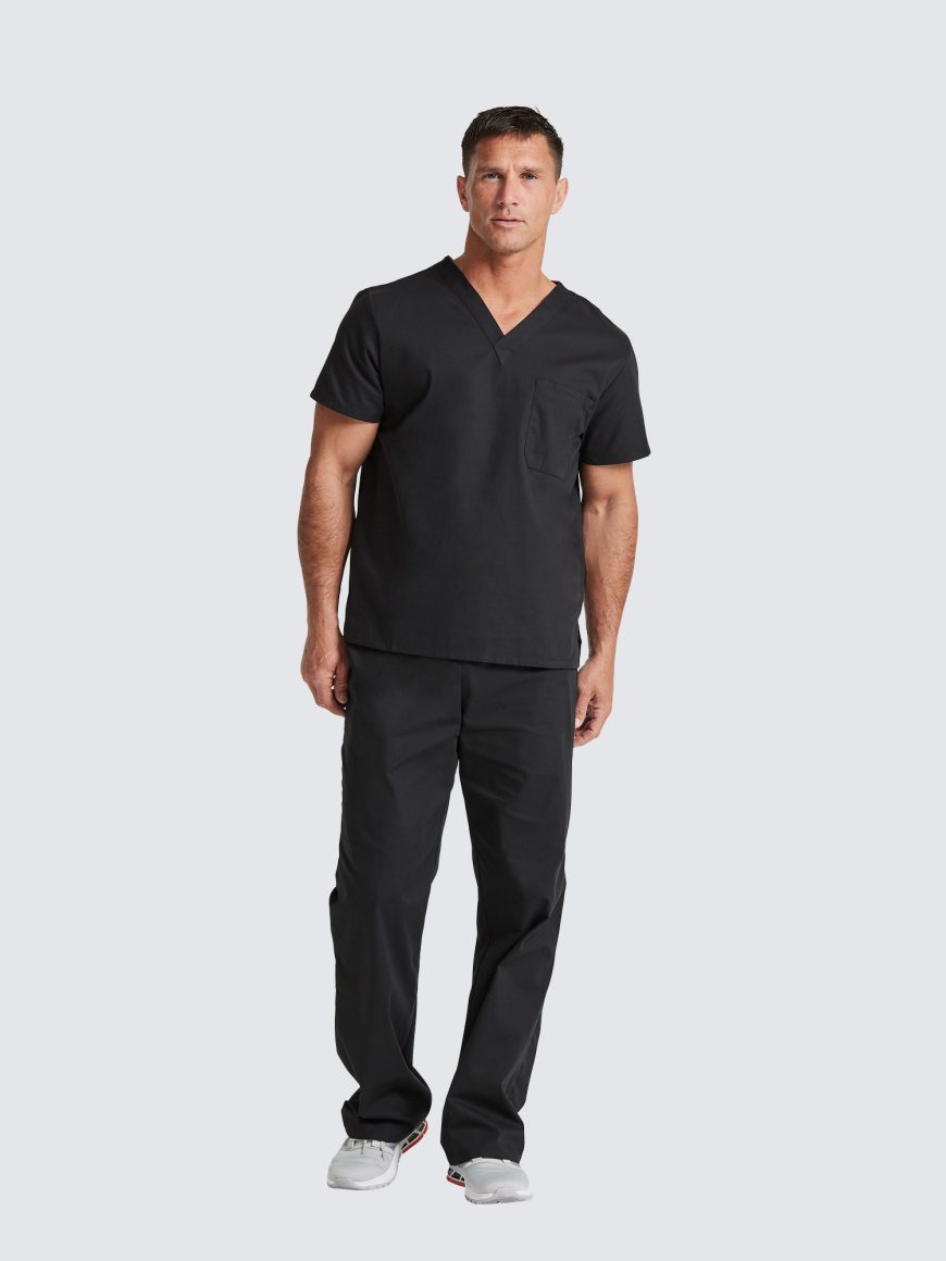 Unisex V-neck top features Dickies logo twill tape at the back neck, a front chest pocket with a bar-tacked pencil slot and side vents.