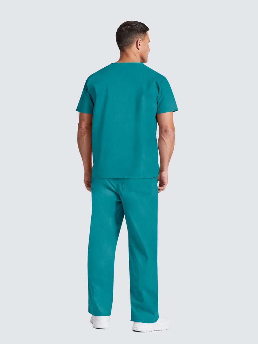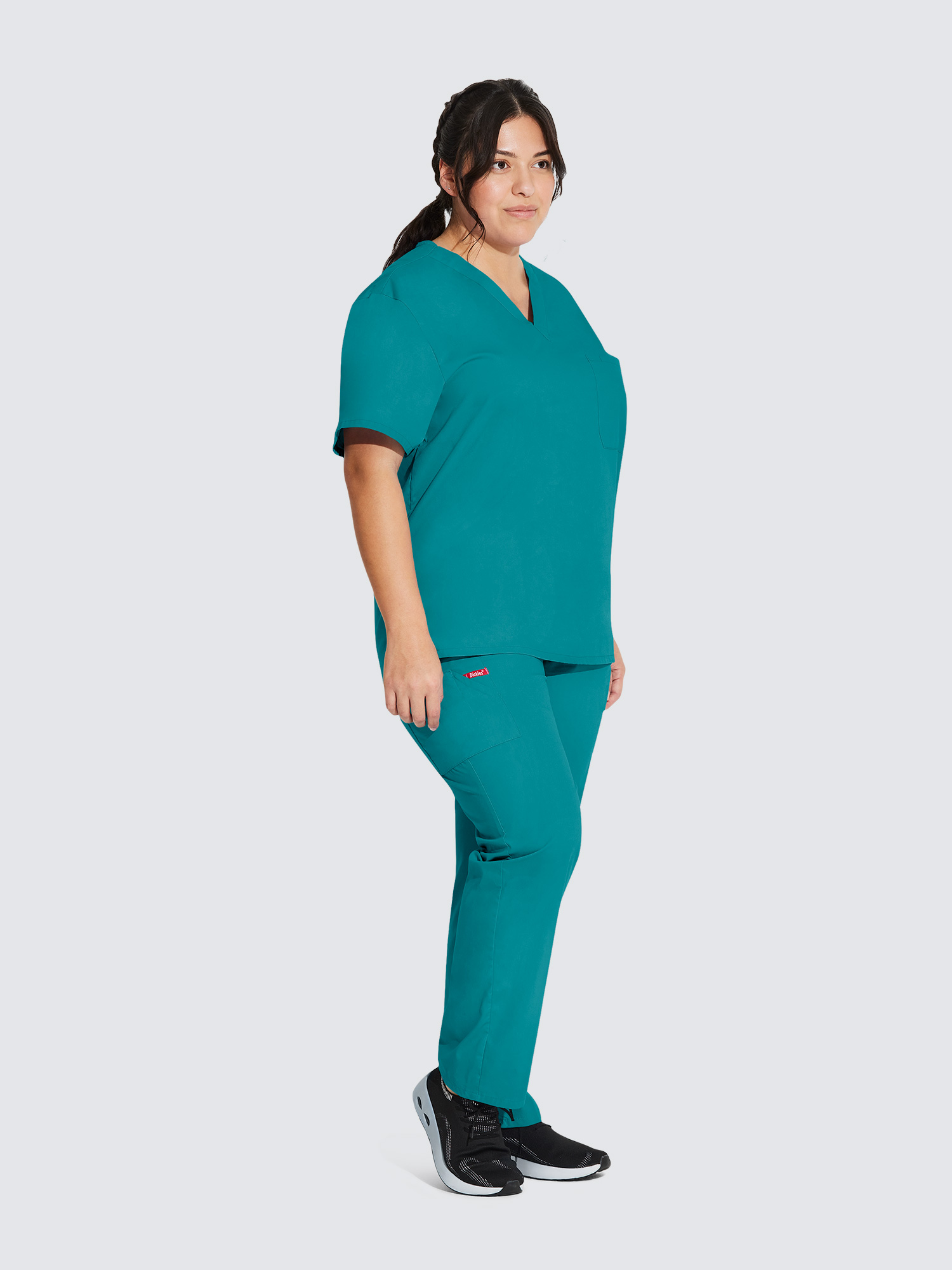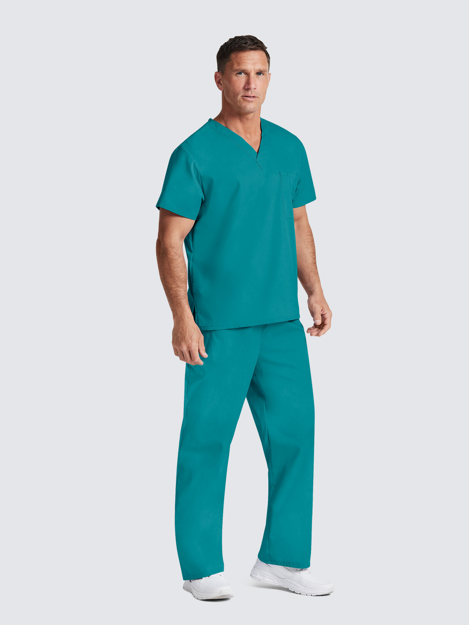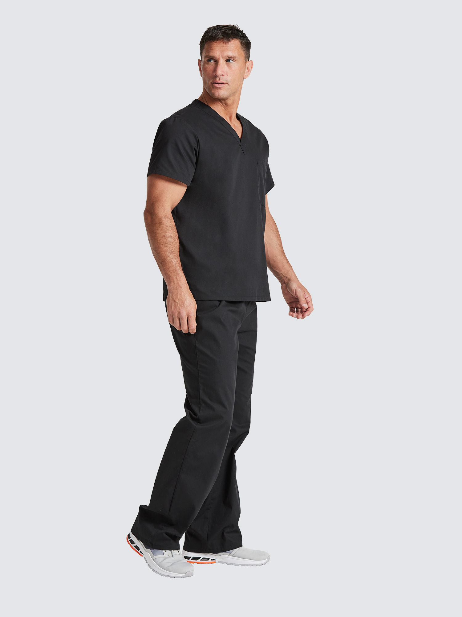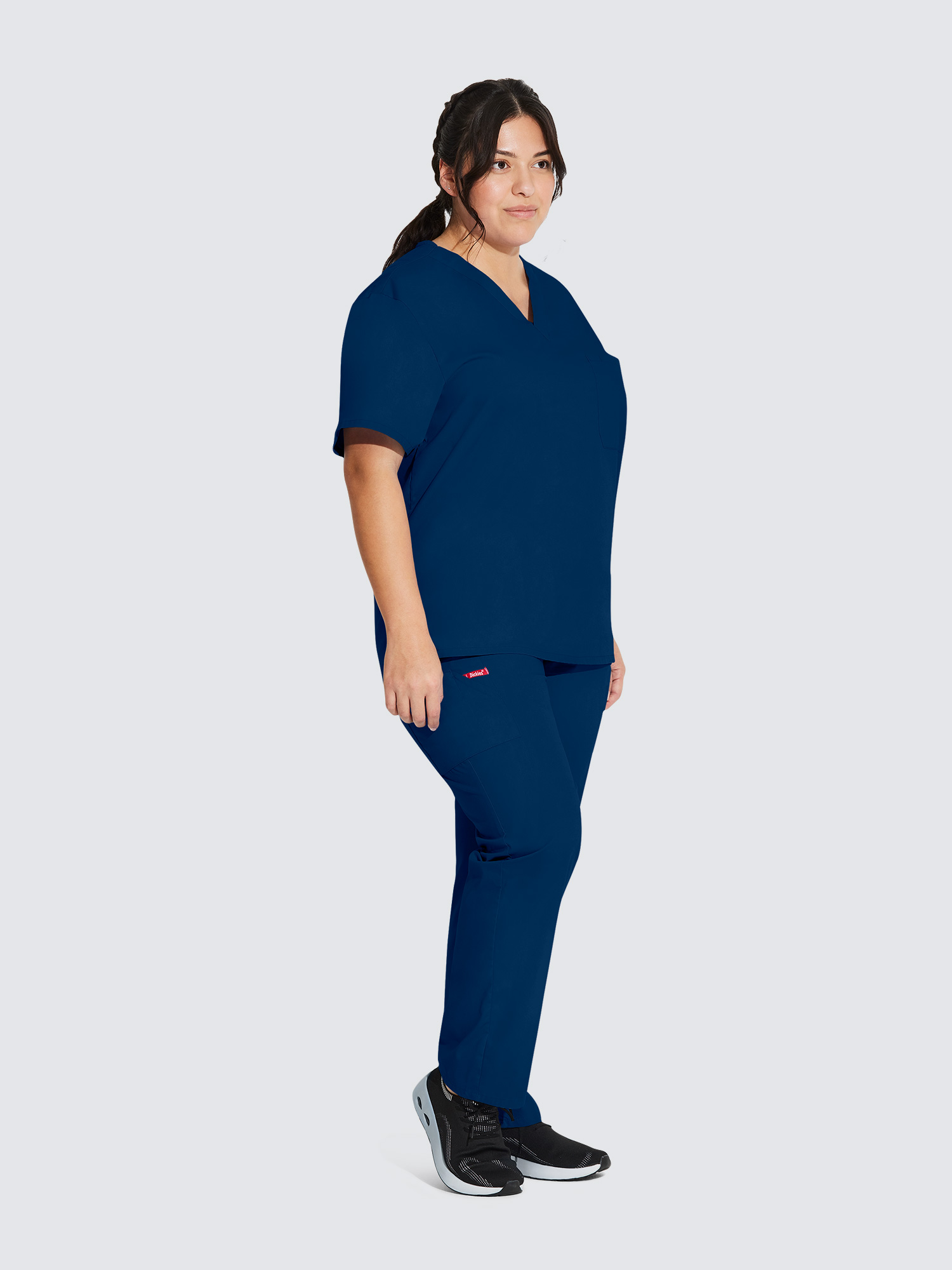 Unisex V-neck top features Dickies logo twill tape at the back neck, a front chest pocket with a bar-tacked pencil slot and side vents.