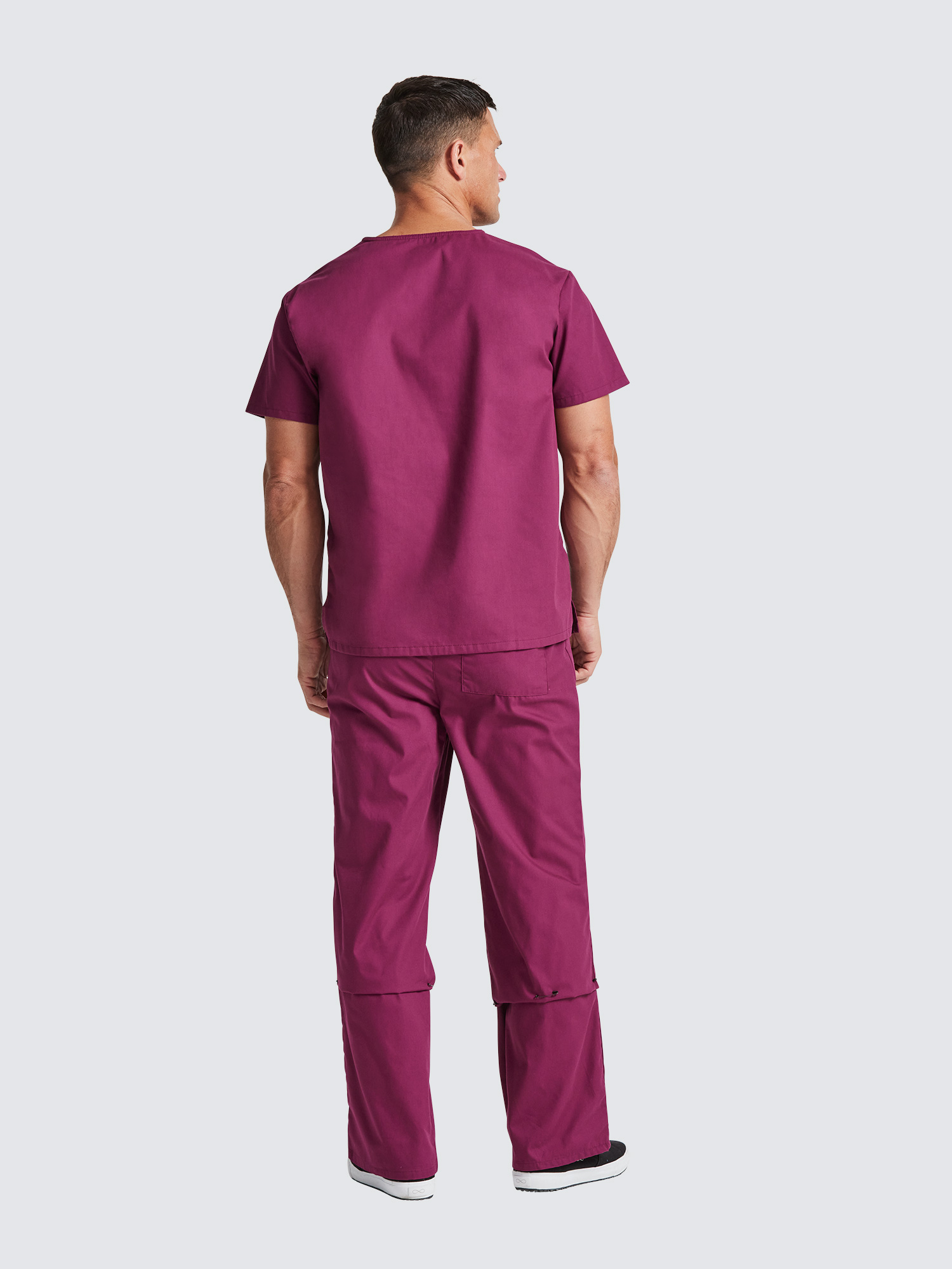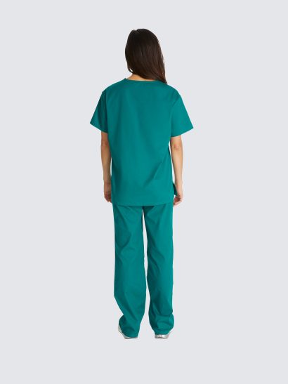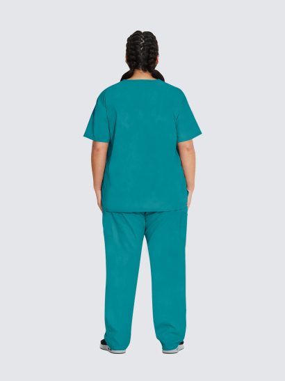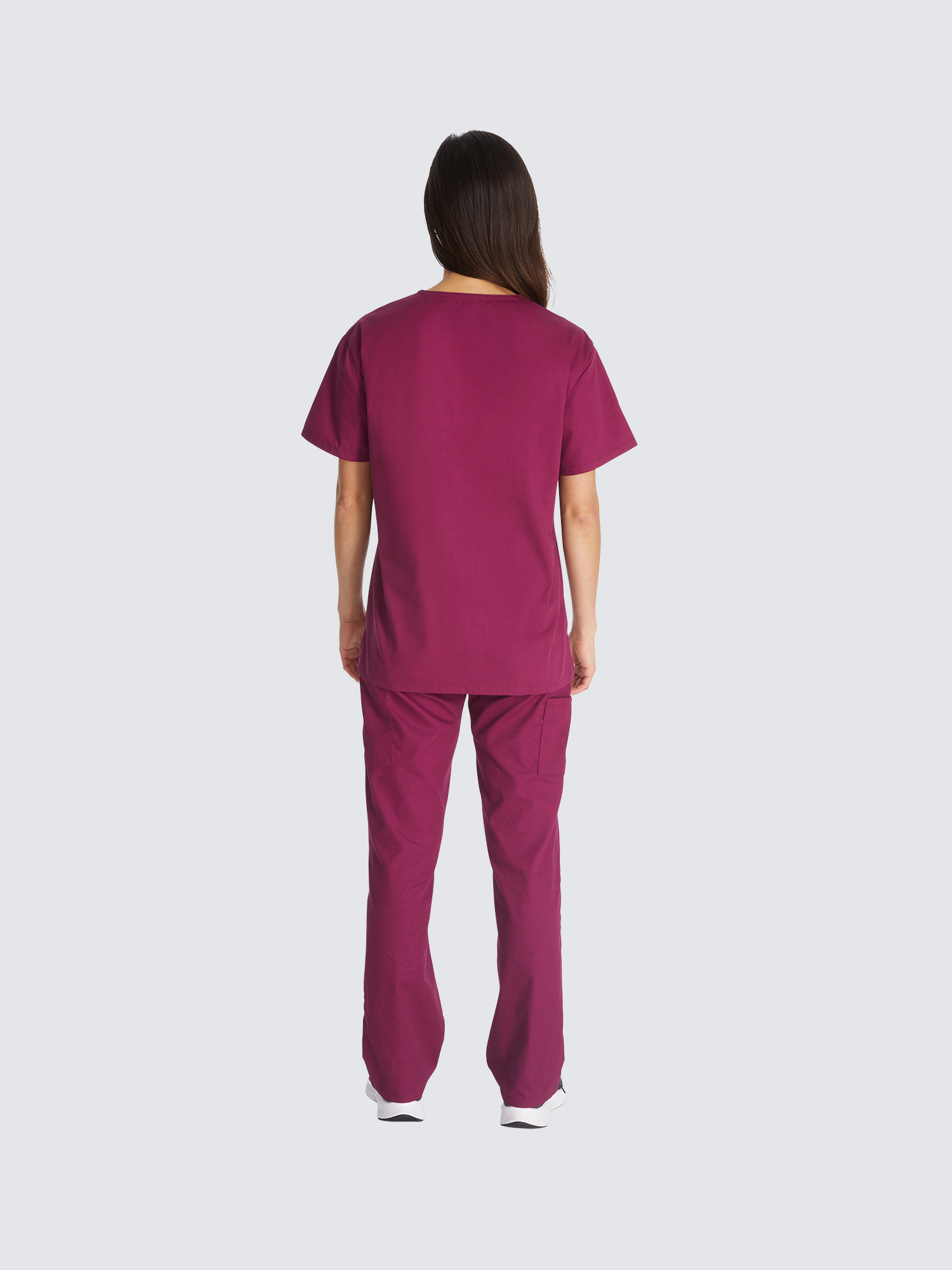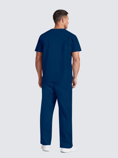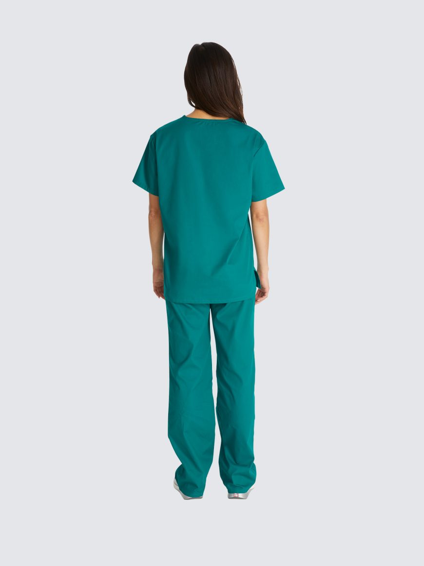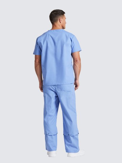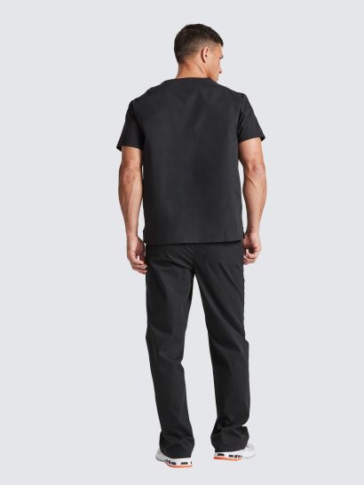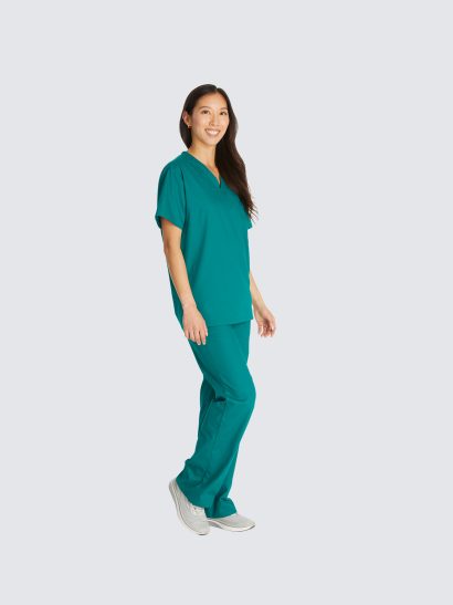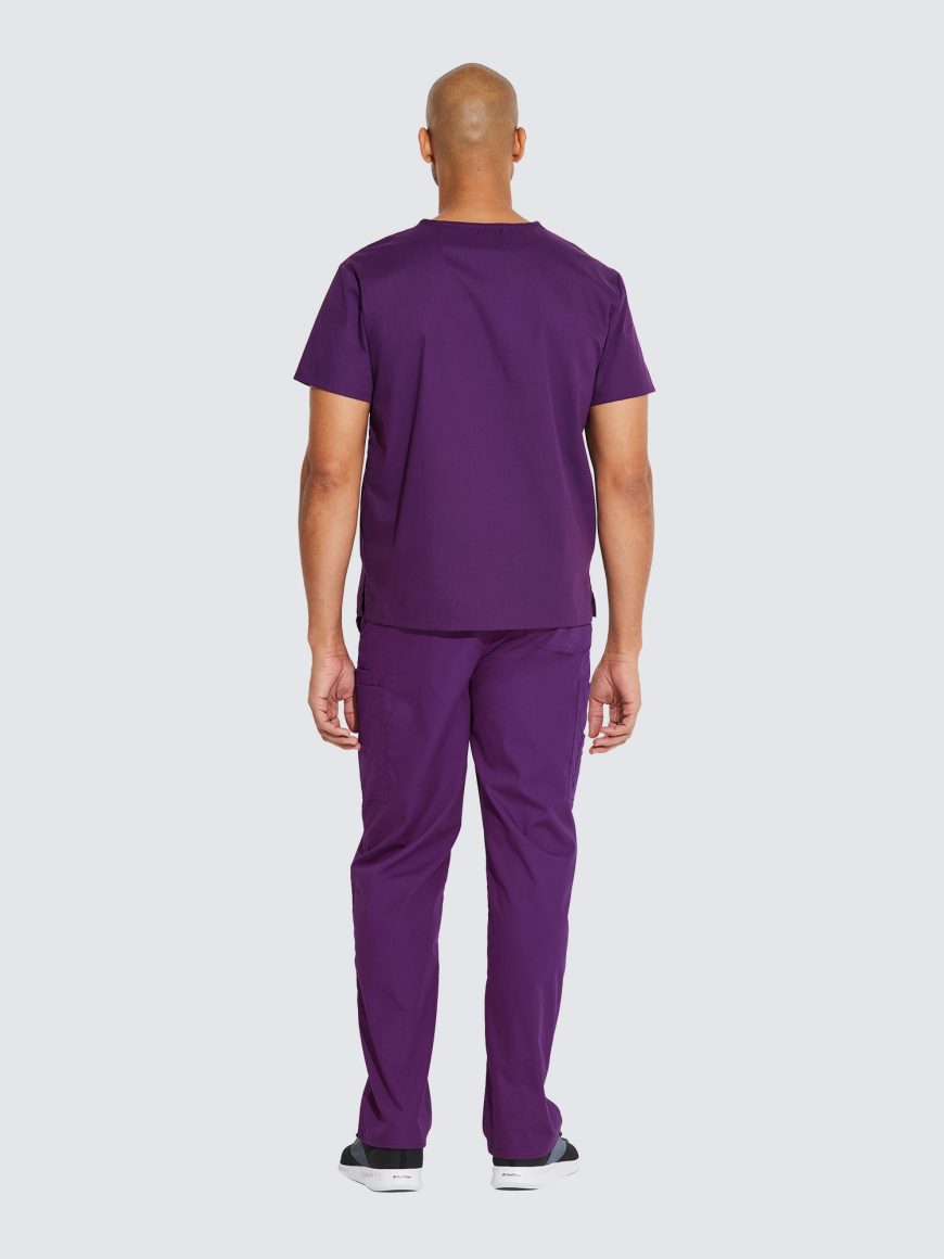 Unisex V-neck top features Dickies logo twill tape at the back neck, a front chest pocket with a bar-tacked pencil slot and side vents.