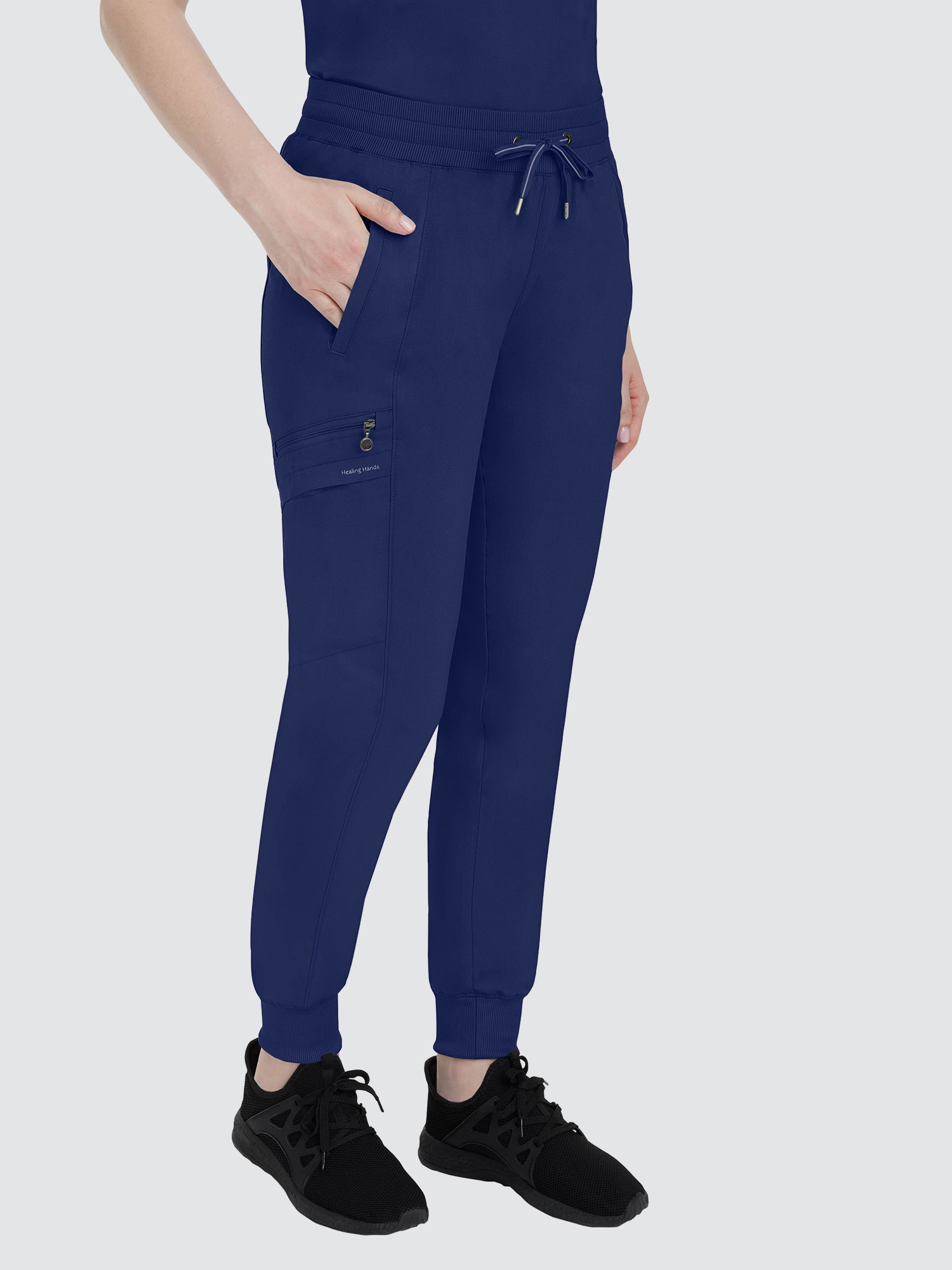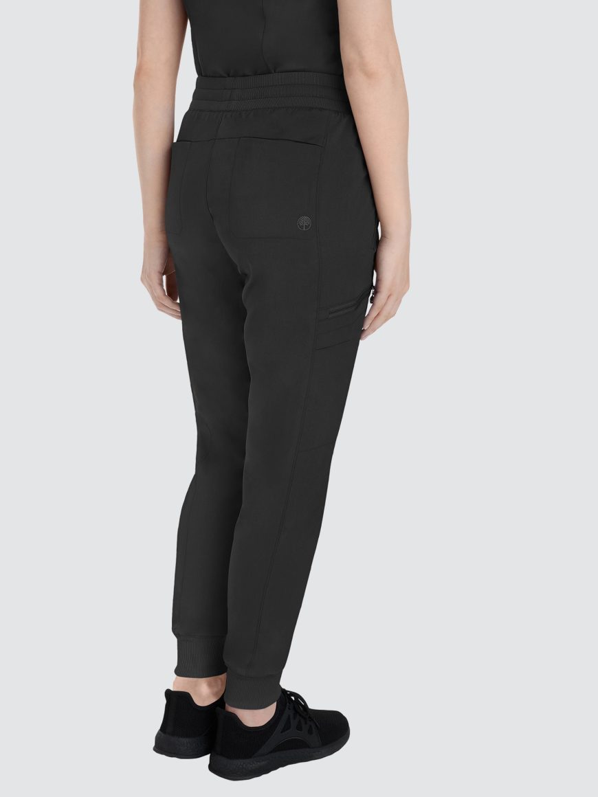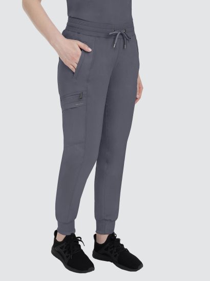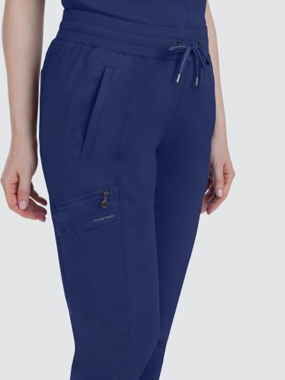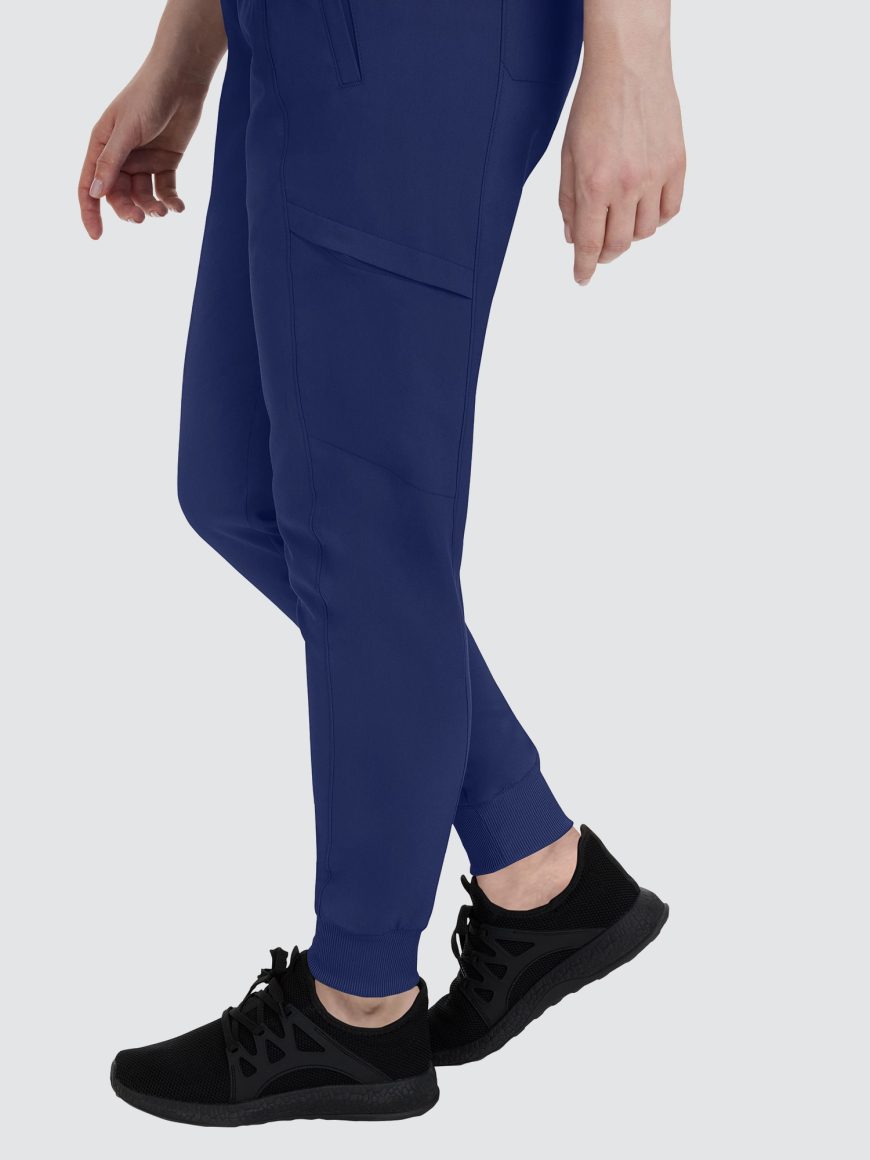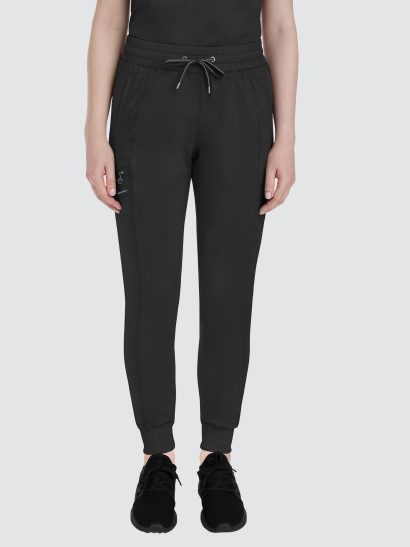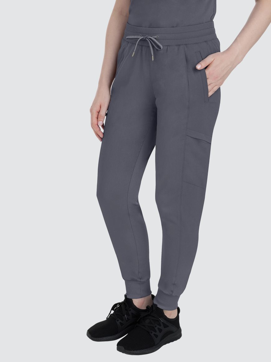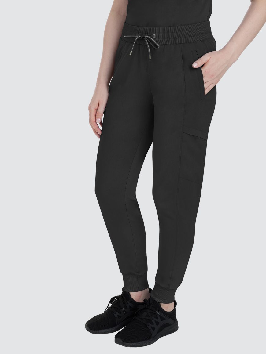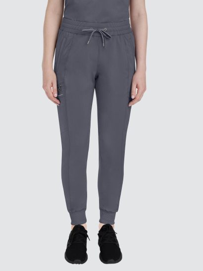 Designed to flatter, this modern fit jogger features a drawstring waistband, racer panel detailing, seven pockets, rib knit waistband with two-way stretch, and leg cuffs.