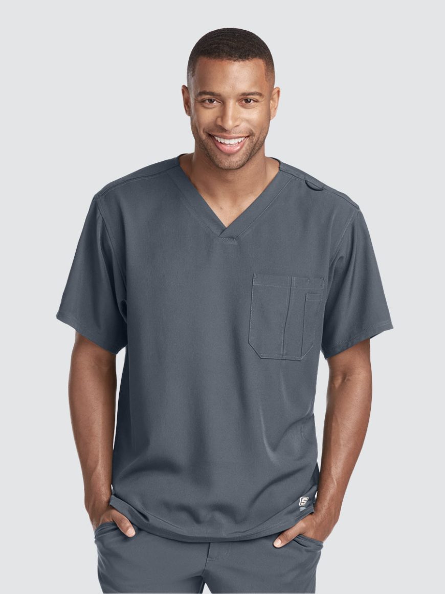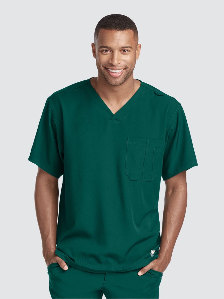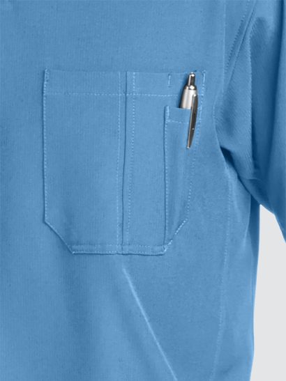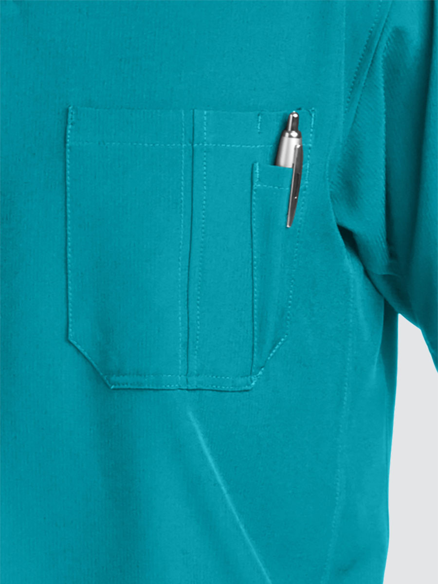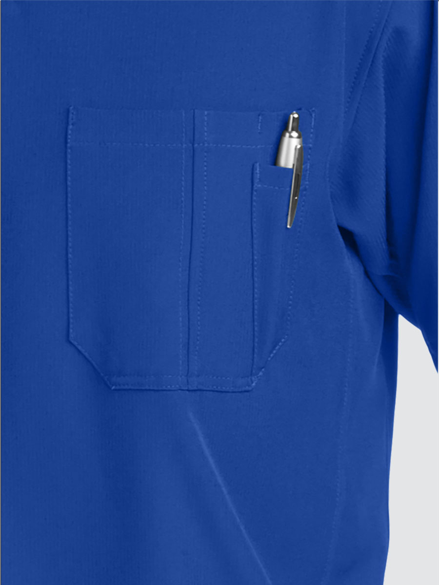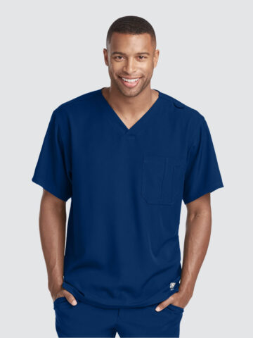 Unisex crossover V-neck tunic top with 1 chest pocket including 1 inset pocket. Full running side step-cut side vent detail
