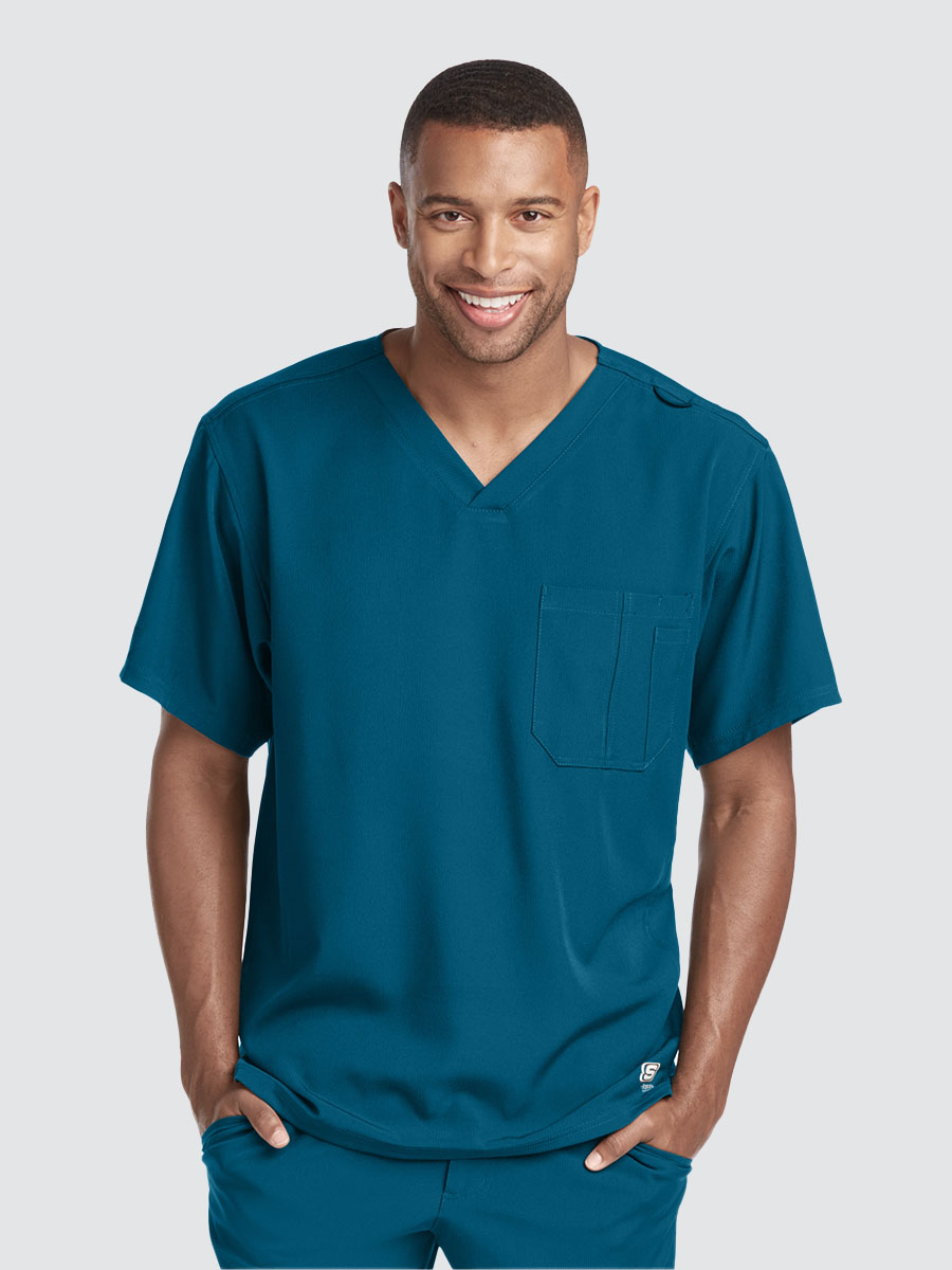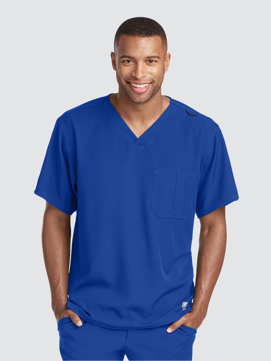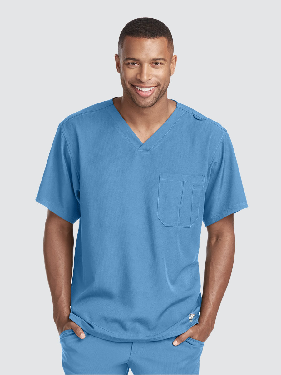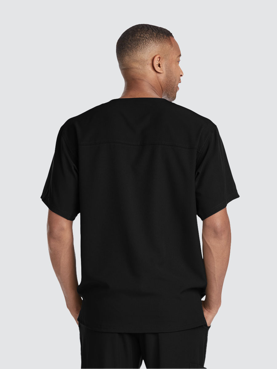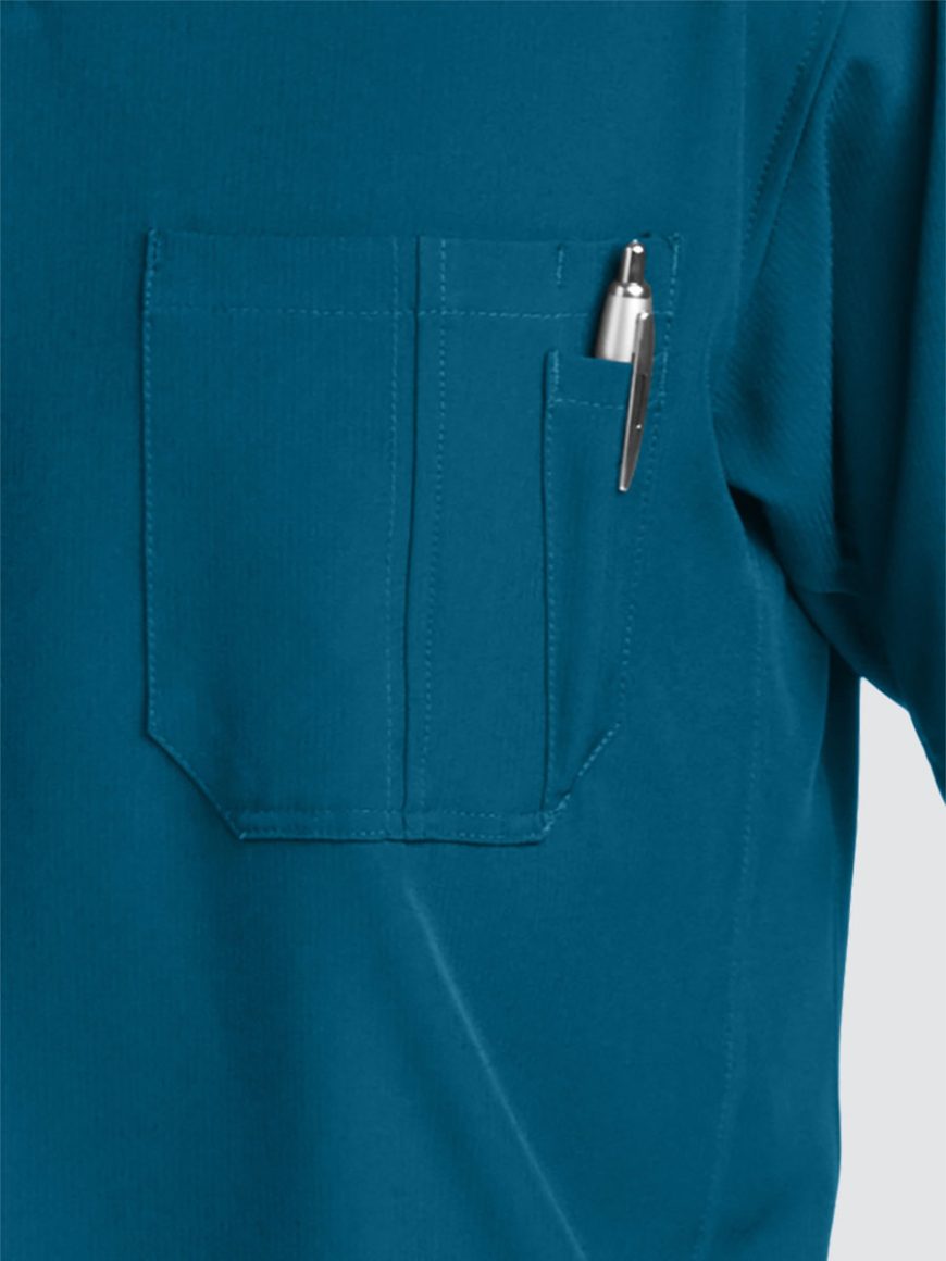 Unisex crossover V-neck tunic top with 1 chest pocket including 1 inset pocket. Full running side step-cut side vent detail