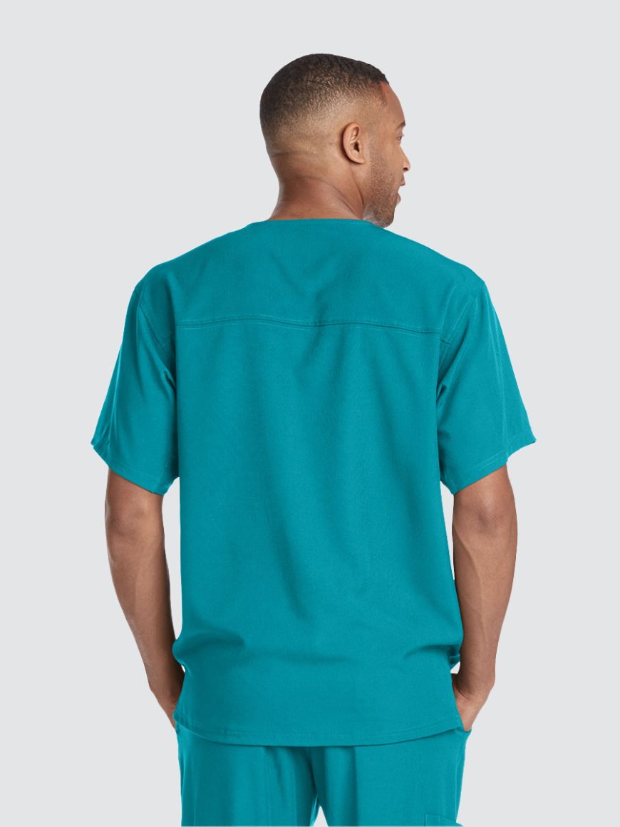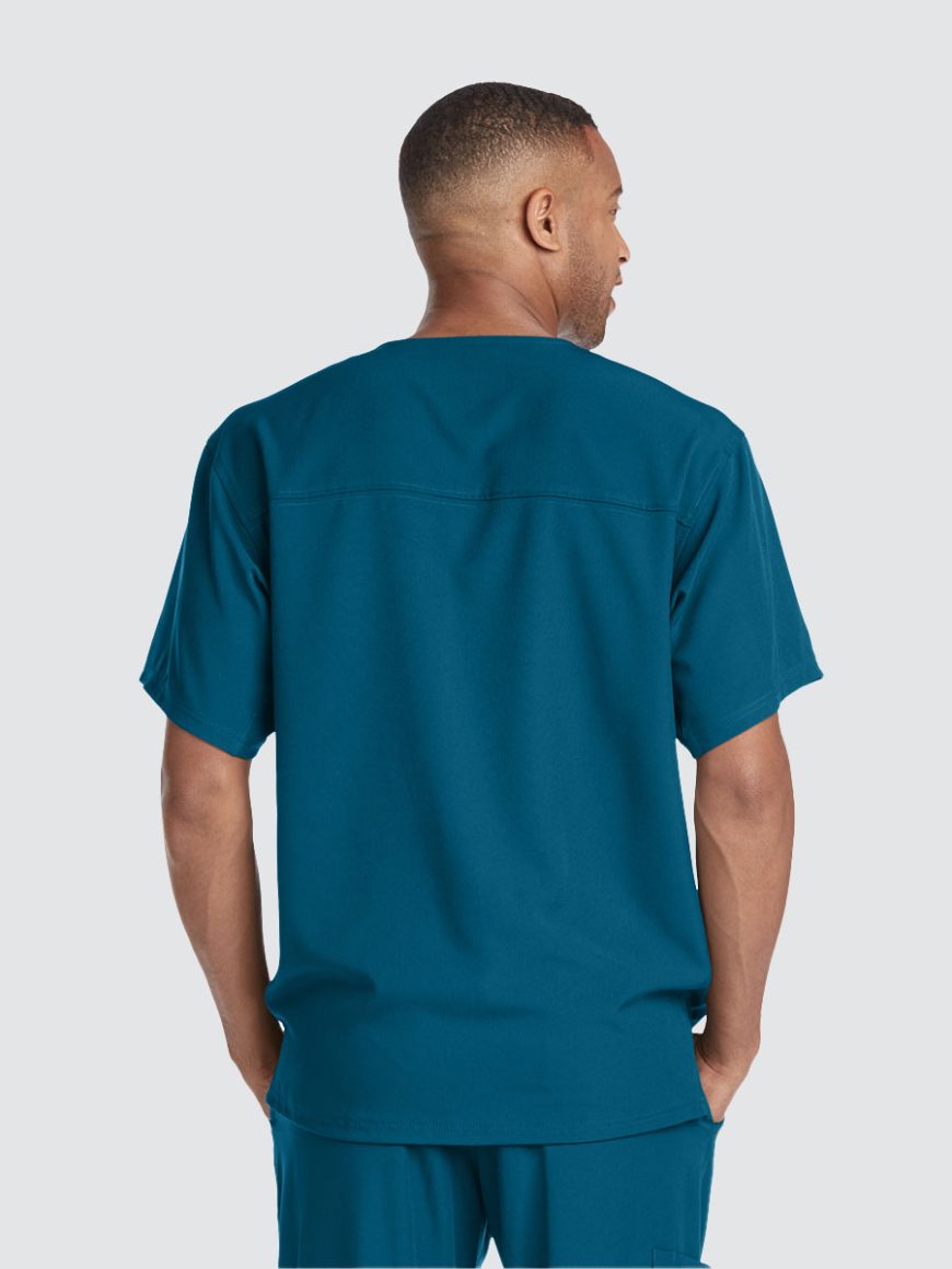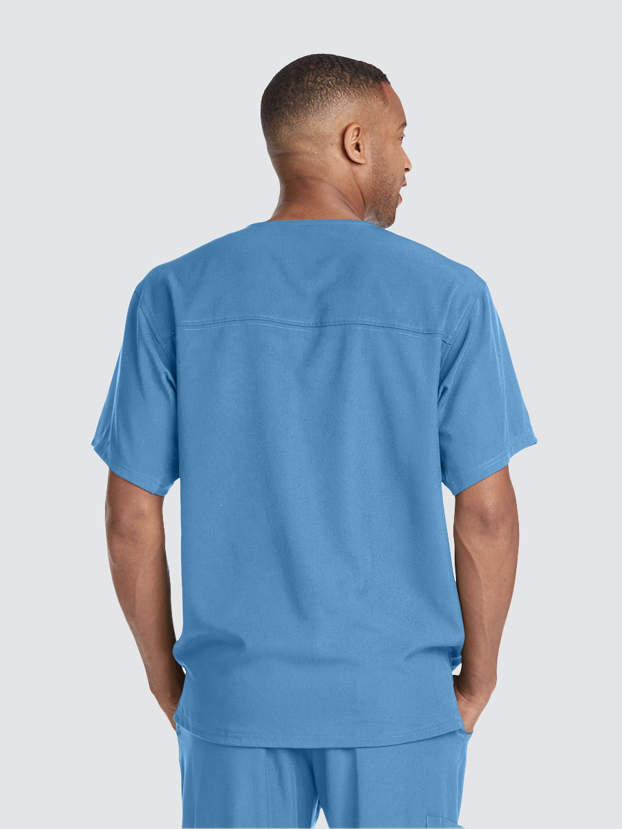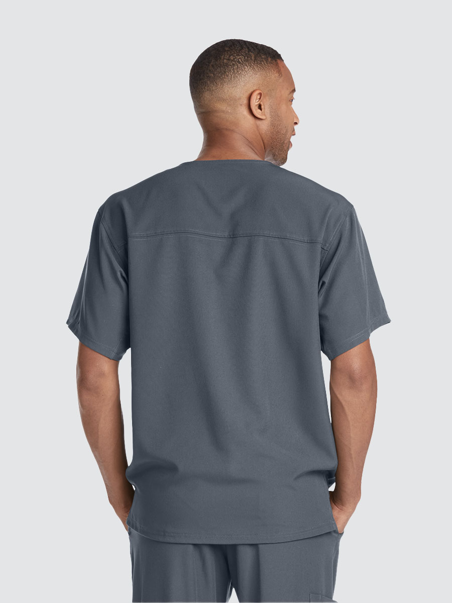 Unisex crossover V-neck tunic top with 1 chest pocket including 1 inset pocket. Full running side step-cut side vent detail