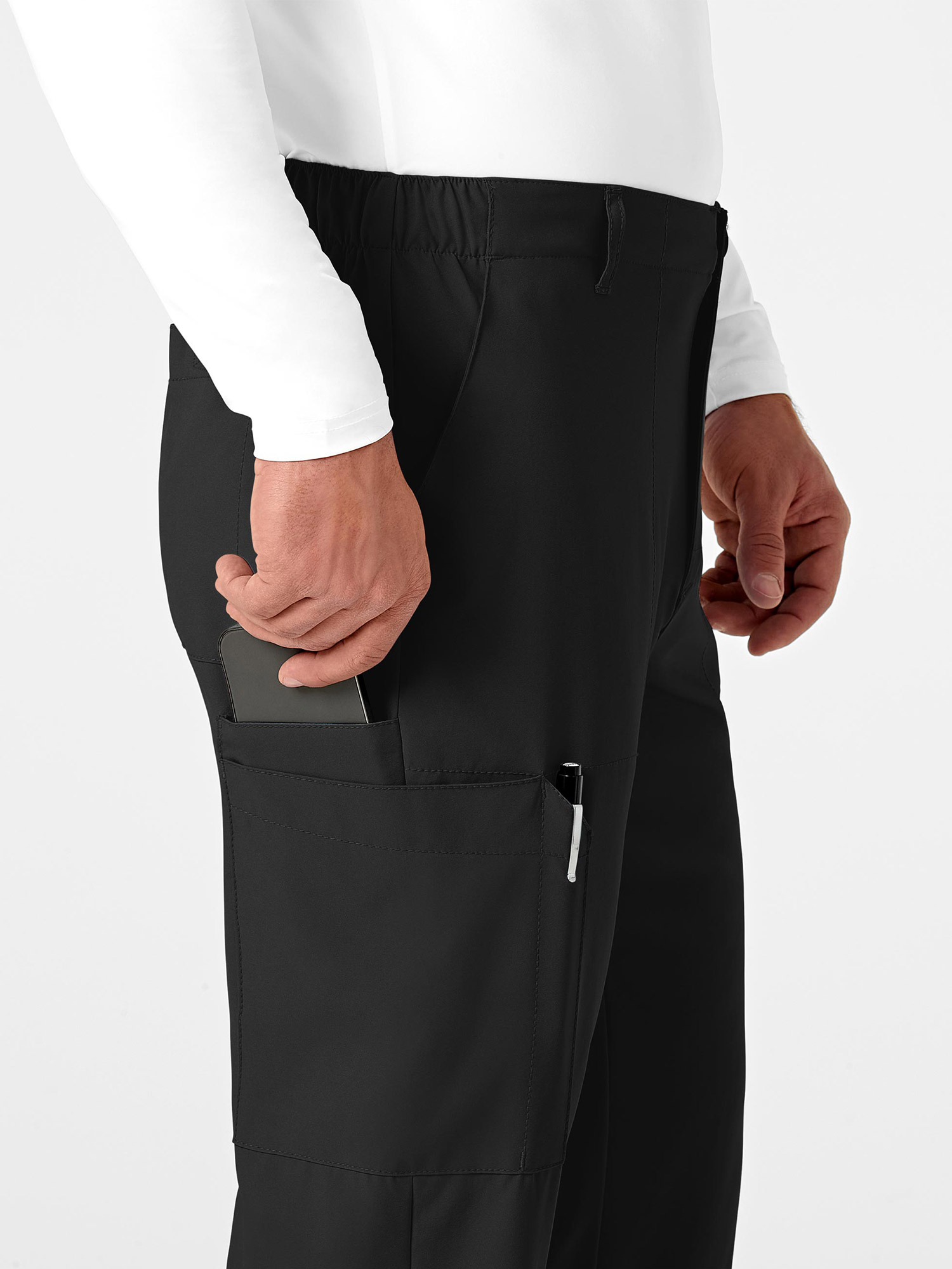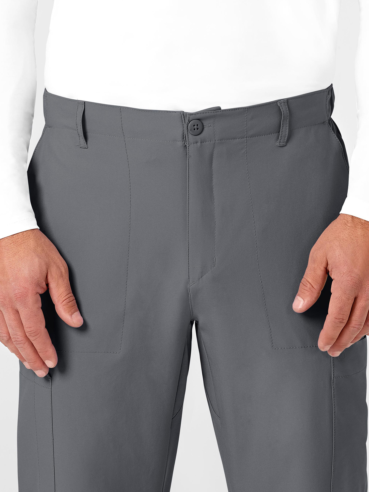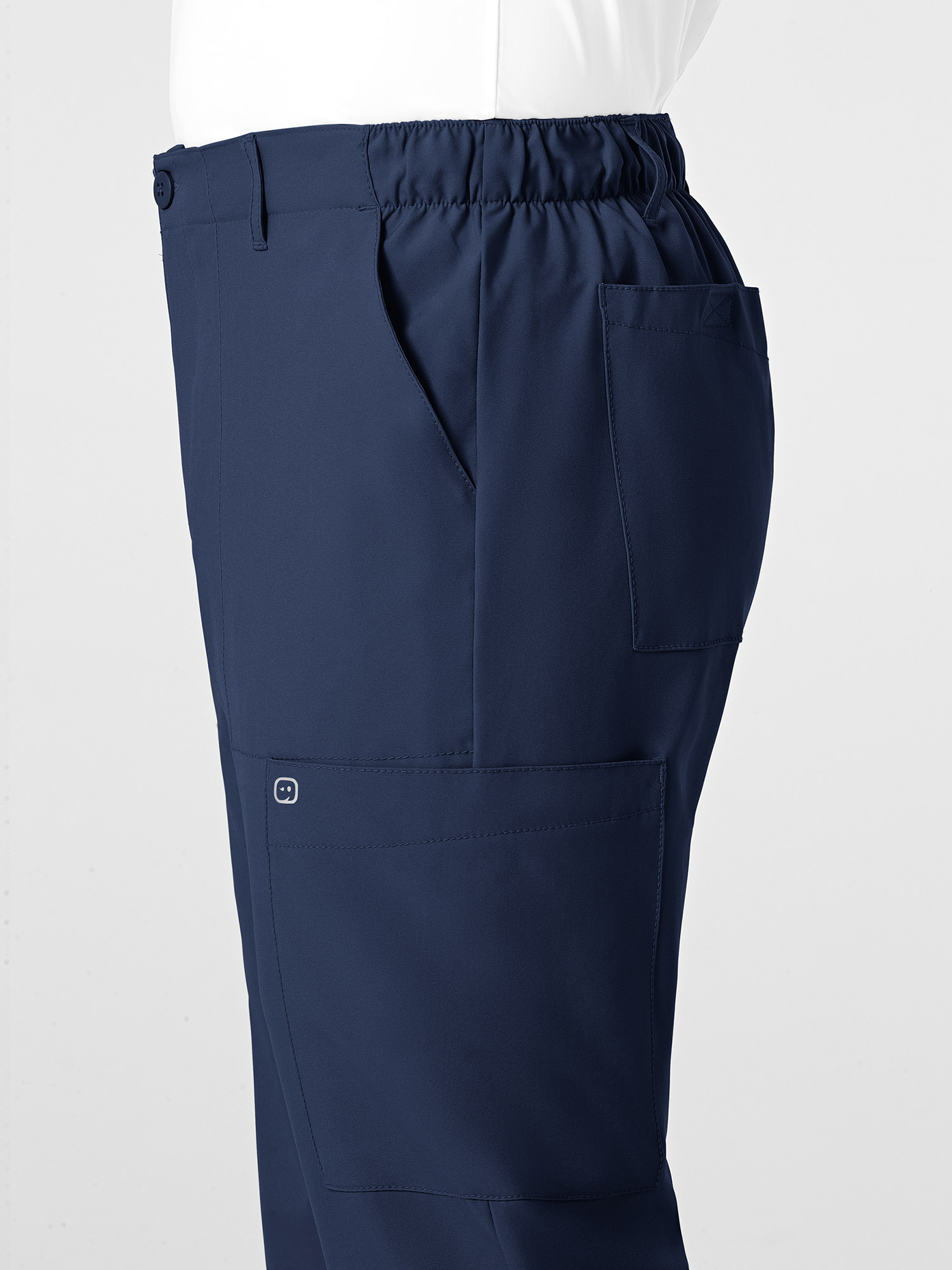 V-neck 4 pocket tunic top and hybrid waist cargo trousers.