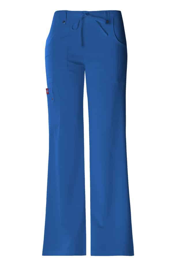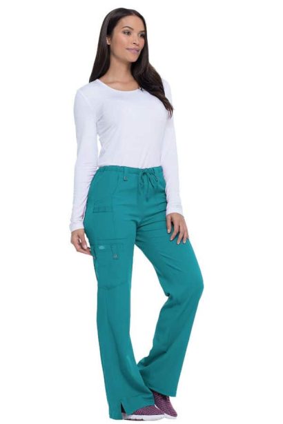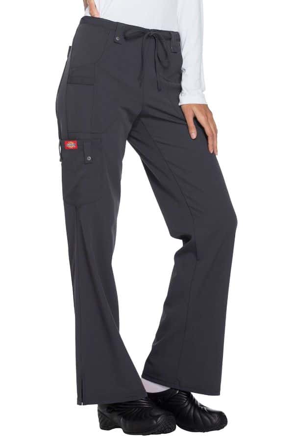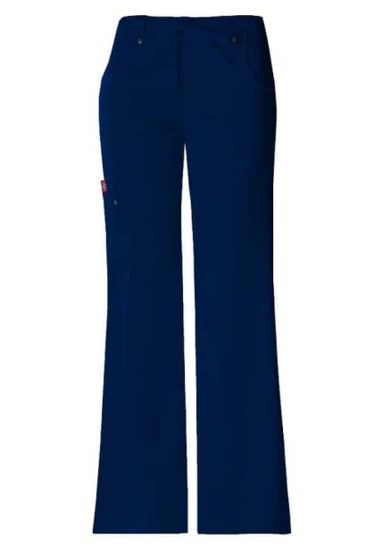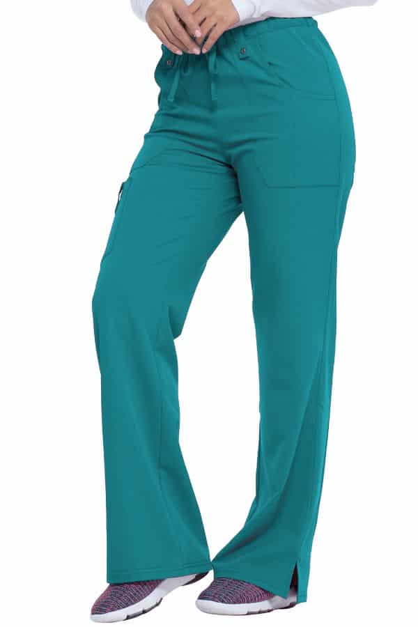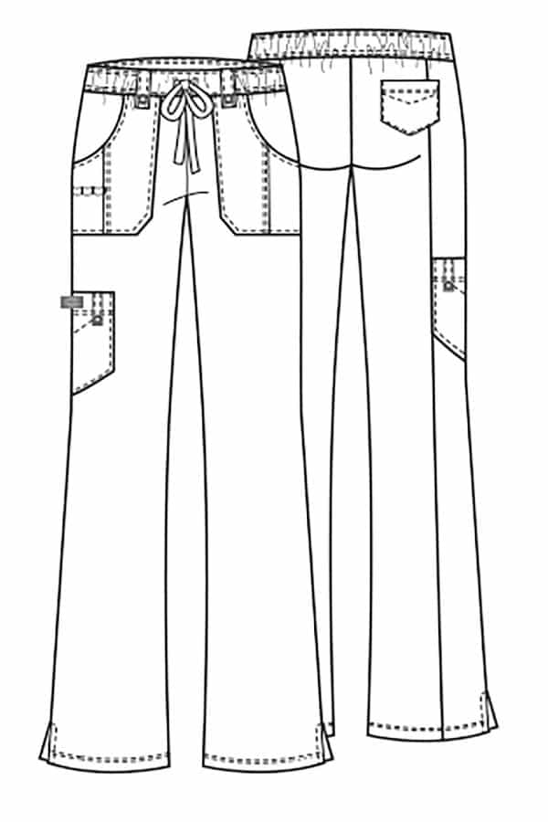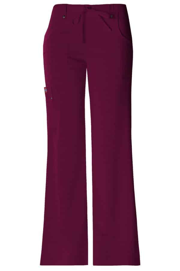 A Contemporary fit, mid rise, moderate flare leg pant features an adjustable drawstring with full elastic waist, and belt loops with decorative logo eyelet detail. Also featured are two patch pockets with pen slots in the right pocket, and a cargo pocket with self loops and logo eyelet.