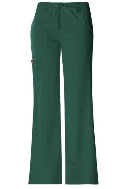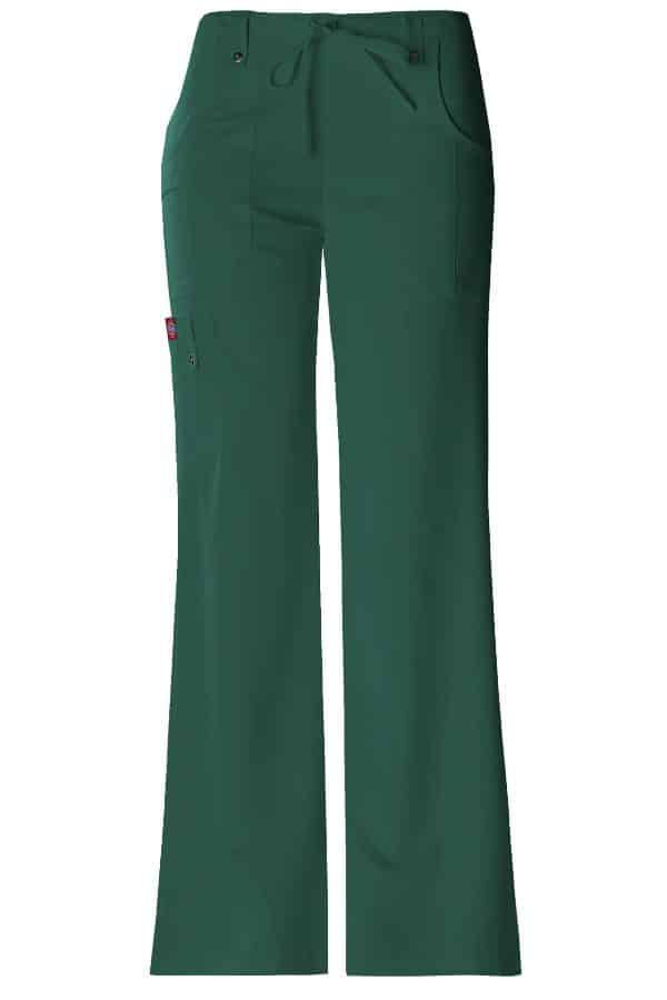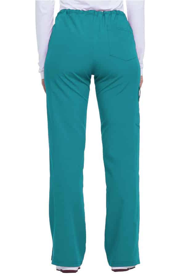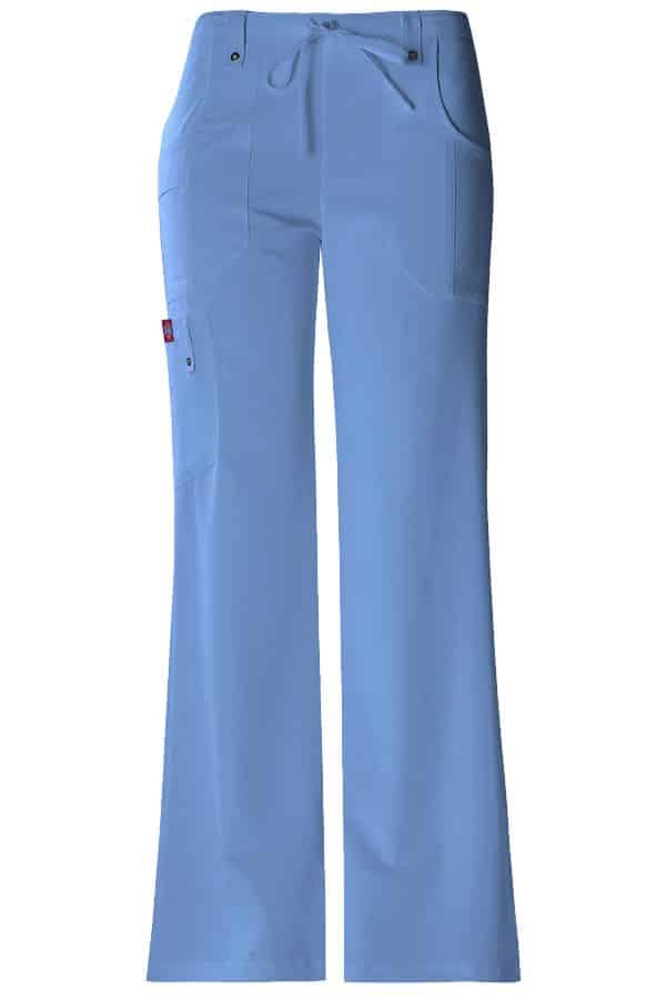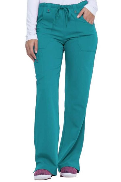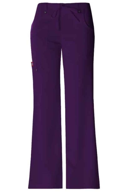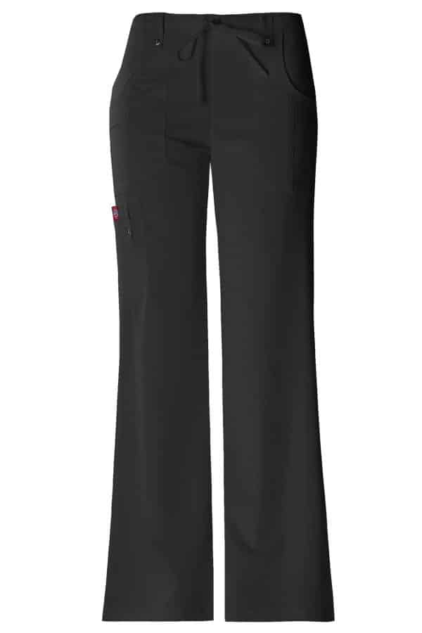 A Contemporary fit, mid rise, moderate flare leg pant features an adjustable drawstring with full elastic waist, and belt loops with decorative logo eyelet detail. Also featured are two patch pockets with pen slots in the right pocket, and a cargo pocket with self loops and logo eyelet.